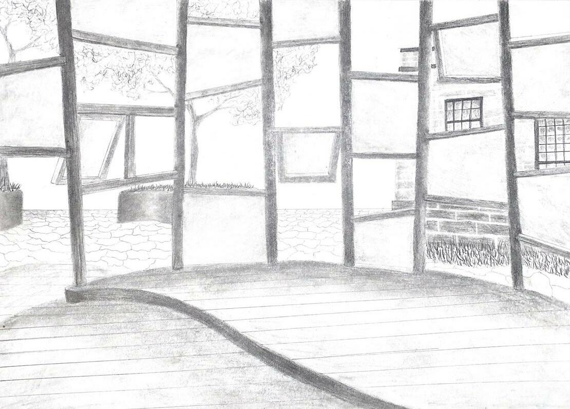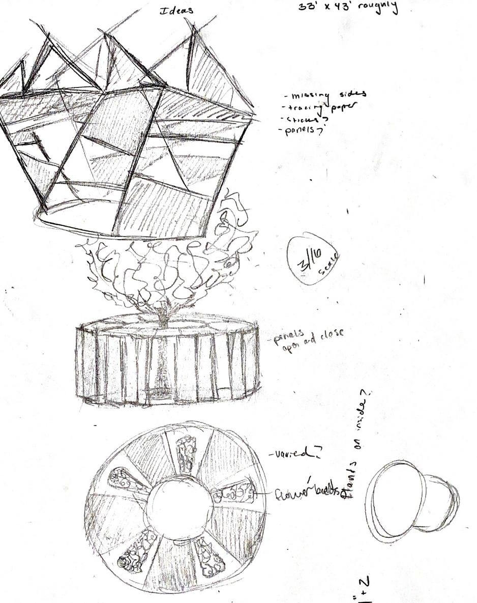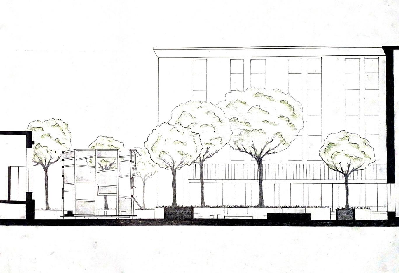 In conjunction with the courtyard, a pavilion was created as a central feature and point of attraction within the courtyard. Emulating the overall themes present within the courtyard, the pavilion is meant to imitate a forest canopy, Like the courtyard, the pavilion design is also intended to generate a sense of peace and calm for both those who experiencing it on the outside and those who are experiencing it from the inside through the filtration of sunlight as well as the capturing of tree shadows across the window panes.
