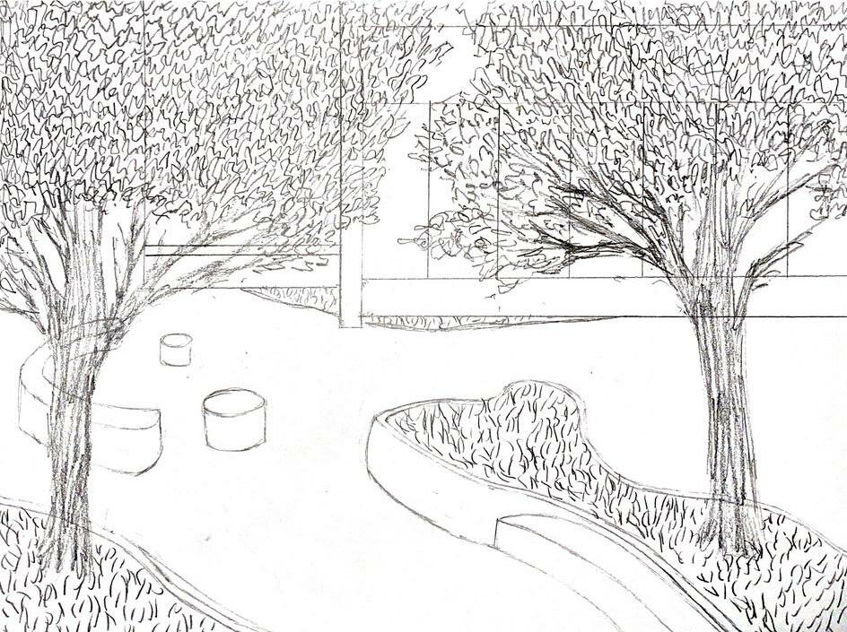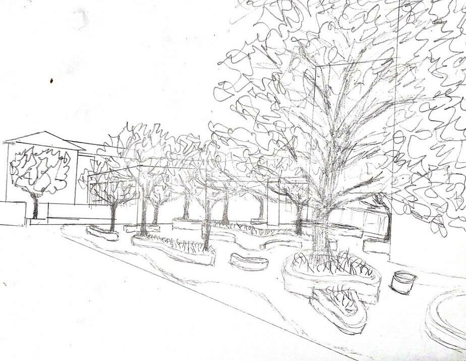The goal of this project was to create a space that served the needs and desires of the various people who could utilize an empty area of land between the library and architecture building of the Detroit Mercy campus. With the desire for a versatile space that could accomadate various events while also maintaing a peaceful atmosphere in mind, the creation of this "courtyard" focussed heavily on the incorporation of natural aspects into the design as well as a stage area that could be used for a variety of purposes.