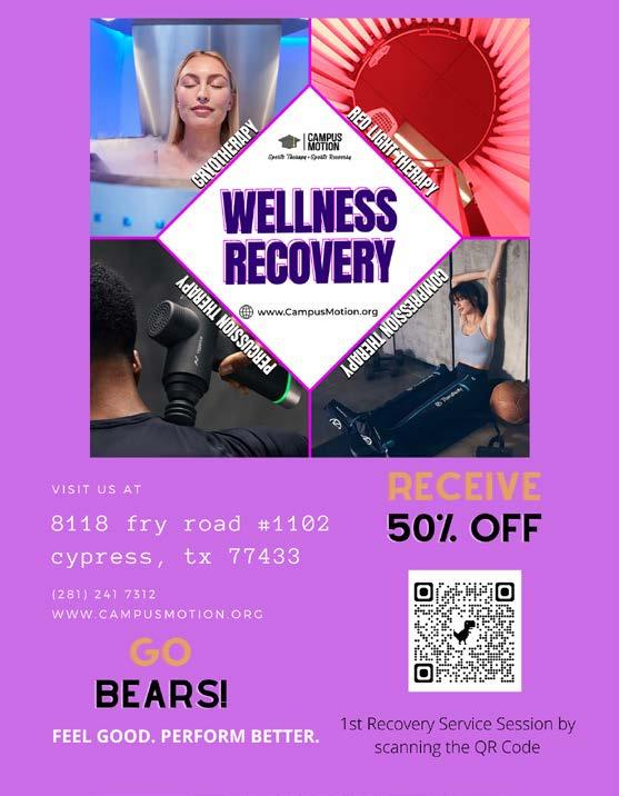 ALL-SPORTS FAN GUIDE | 3 Houston’s First Baptist Church, Cypress business ads Cypress Optique Houston Methodist Orthopedics & Sports Medicine Haidamous & Associates Maelia Davis, ReMax Pit Stop Pool Service Campus Motion Sports Recovery Phlox Photography The Howard Huges Corporation - Bridgeland