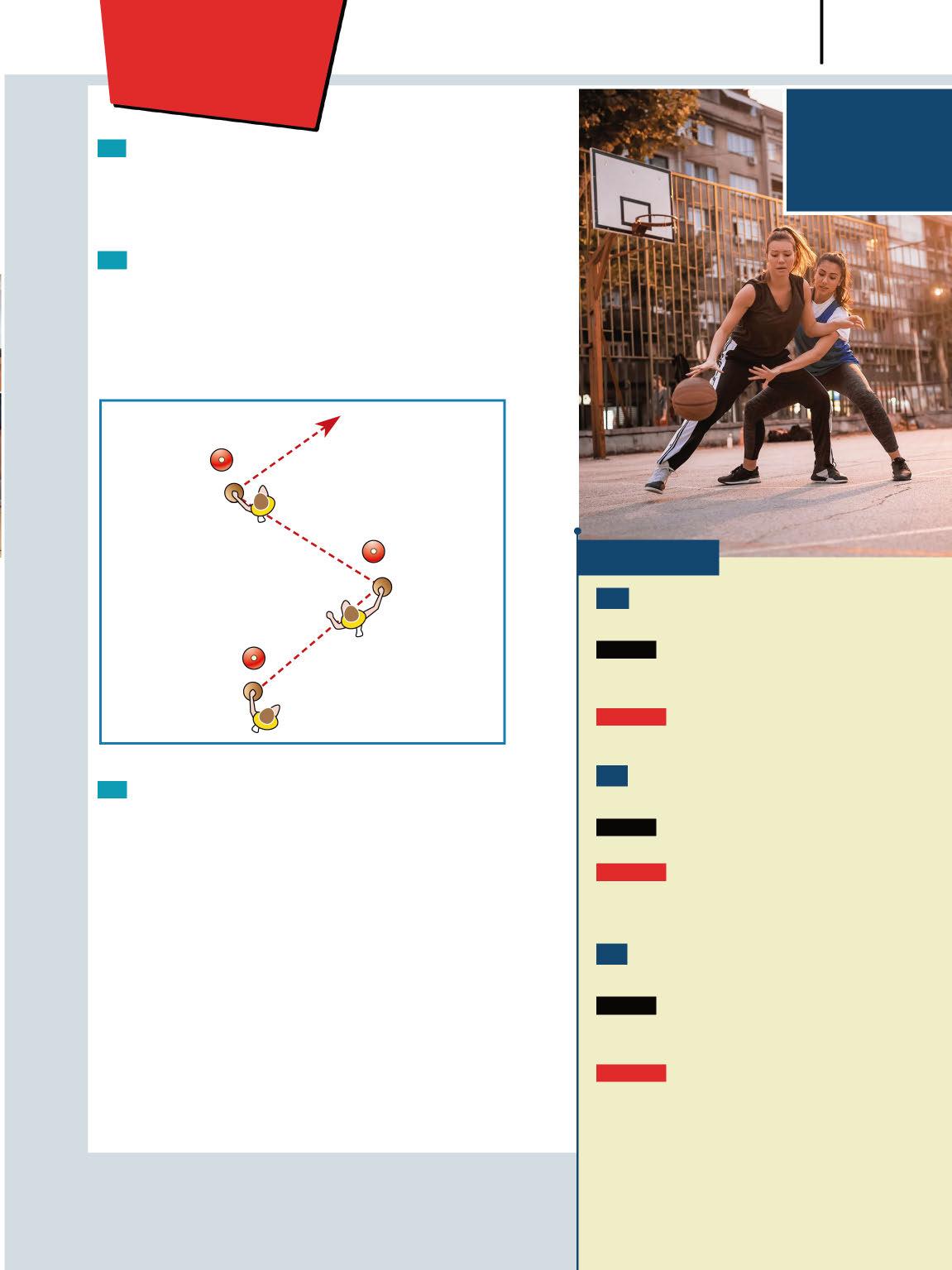 Con la palla davanti al primo birillo. Correre palleggiando tra i birilli senza toccarli, cambiando mano a ogni cambio di direzione; superato l’ultimo birillo, eseguire un terzo tempo con tiro da sotto.