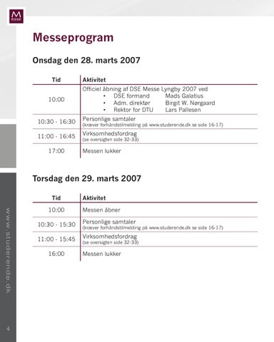 Aktivitet Officiel åbning af DSE Messe Lyngby 2007 ved • DSE formand Mads Galatius • Adm. direktør Birgit W. Nørgaard • Rektor for DTU Lars Pallesen Personlige samtaler