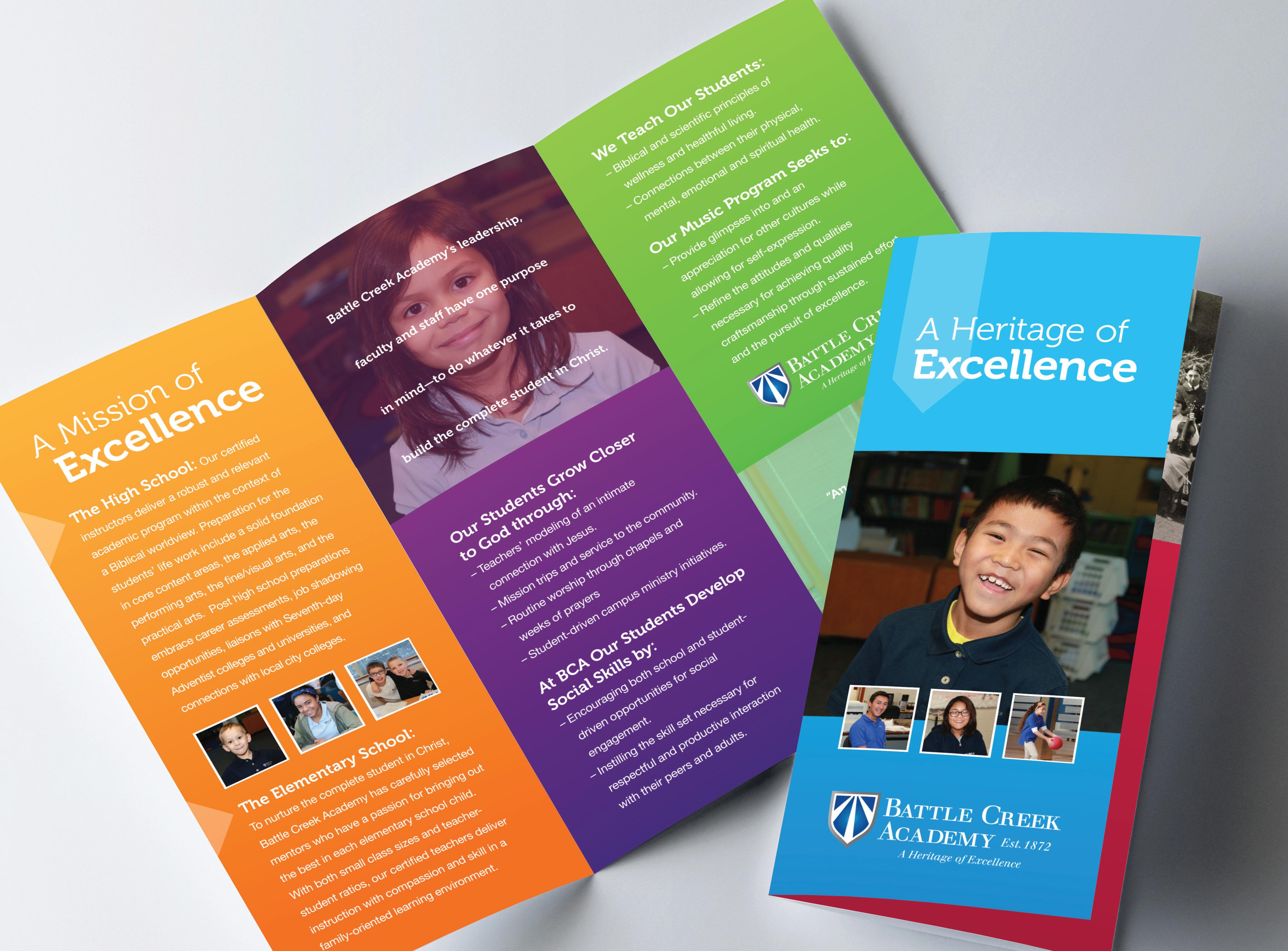 Maintaining the existing logo and color palette, a tri-fold brochure was designed to communicate what makes Battle Creek Academy stand apart from it’s competition by highlighting the areas of academia they excel in, while using friendly pictures conveying the welcoming atmosphere.