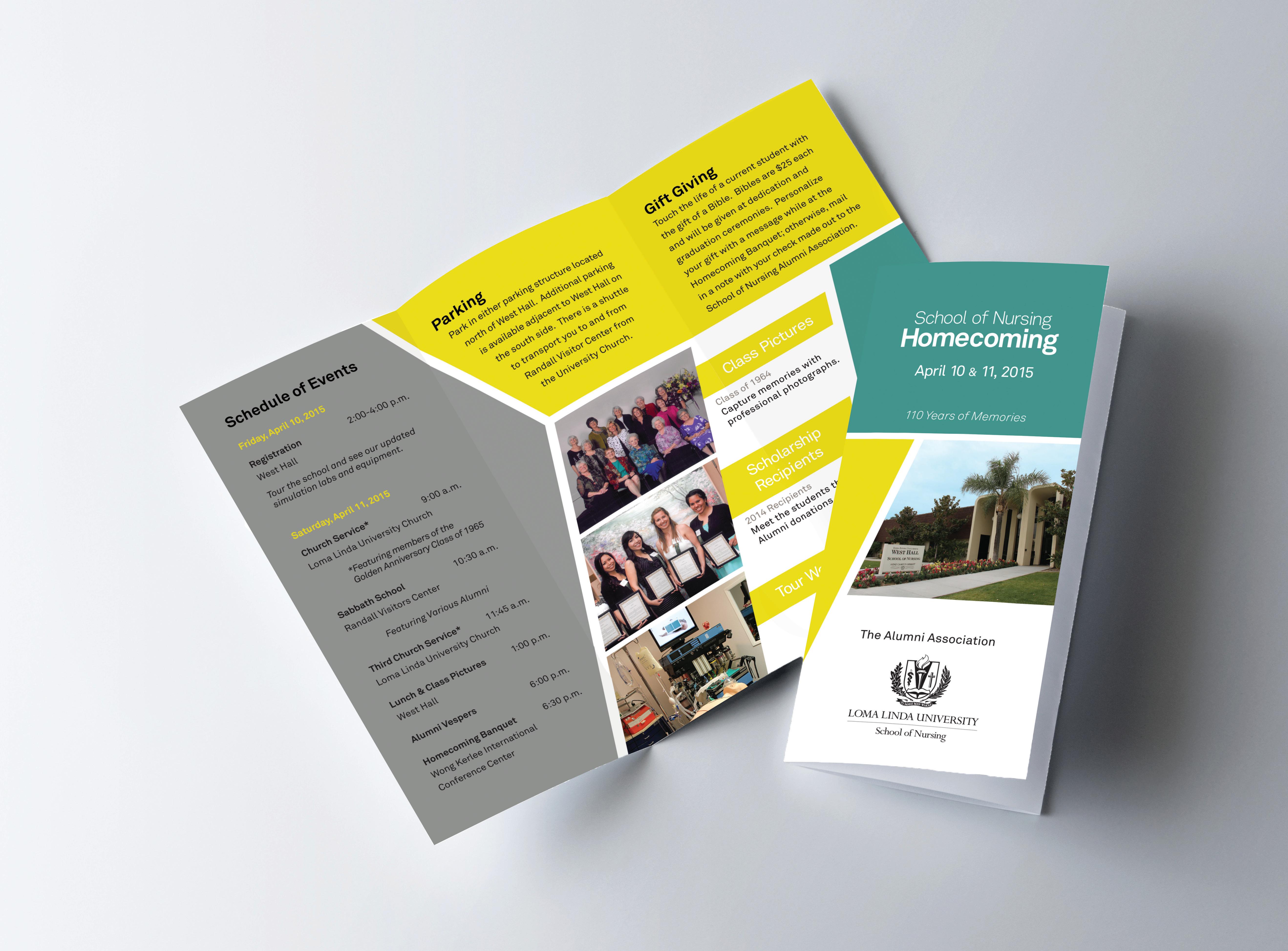 This brochure was designed as a mailer to be sent out to Alumni of Loma Linda University in California. The brochure included the reunion weekend itinerary and an RSVP mailer to be returned for confirmation.