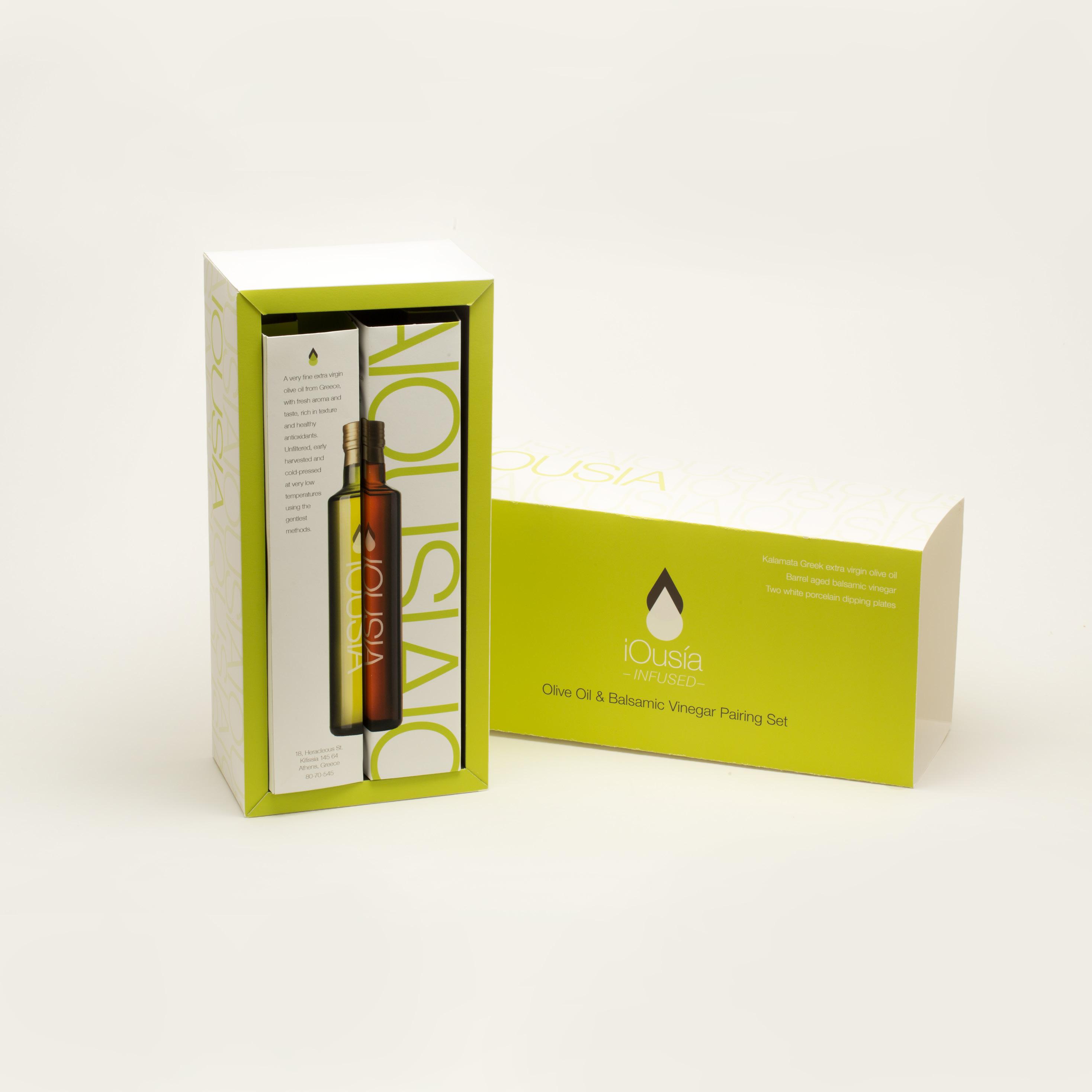 Ousia, the enunciation of the Greek word meaning ‘essence’ is an oil and vinegar brand. The three piece set includes oil, vinegar and dipping plates. Each come in an individual box, and are collectively packaged into a fourth and final box.
