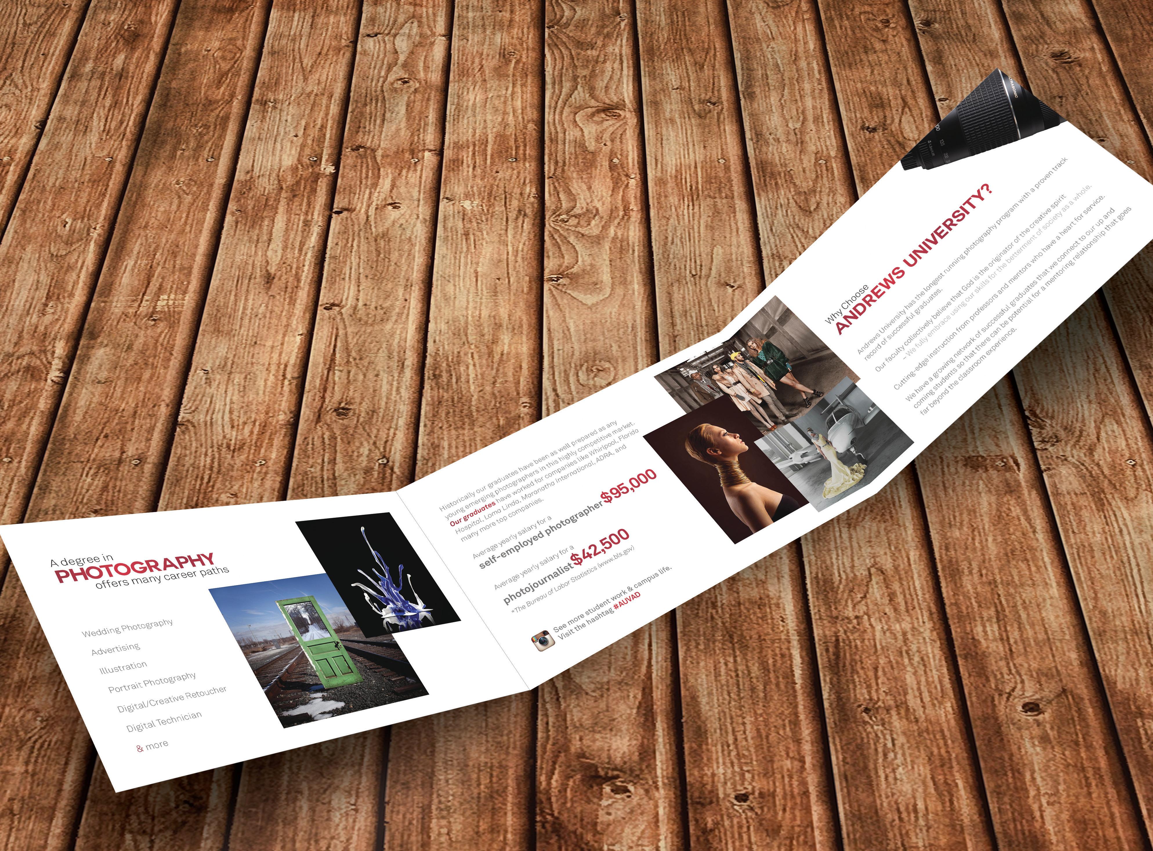A departmental promotional piece for my Alma Mater, designed to promote and encourage an interest and career in the arts. Four brochures were designed to inform of potential careers options and salary averages one could have with various BFA degrees as well as why Andrews is the best option.