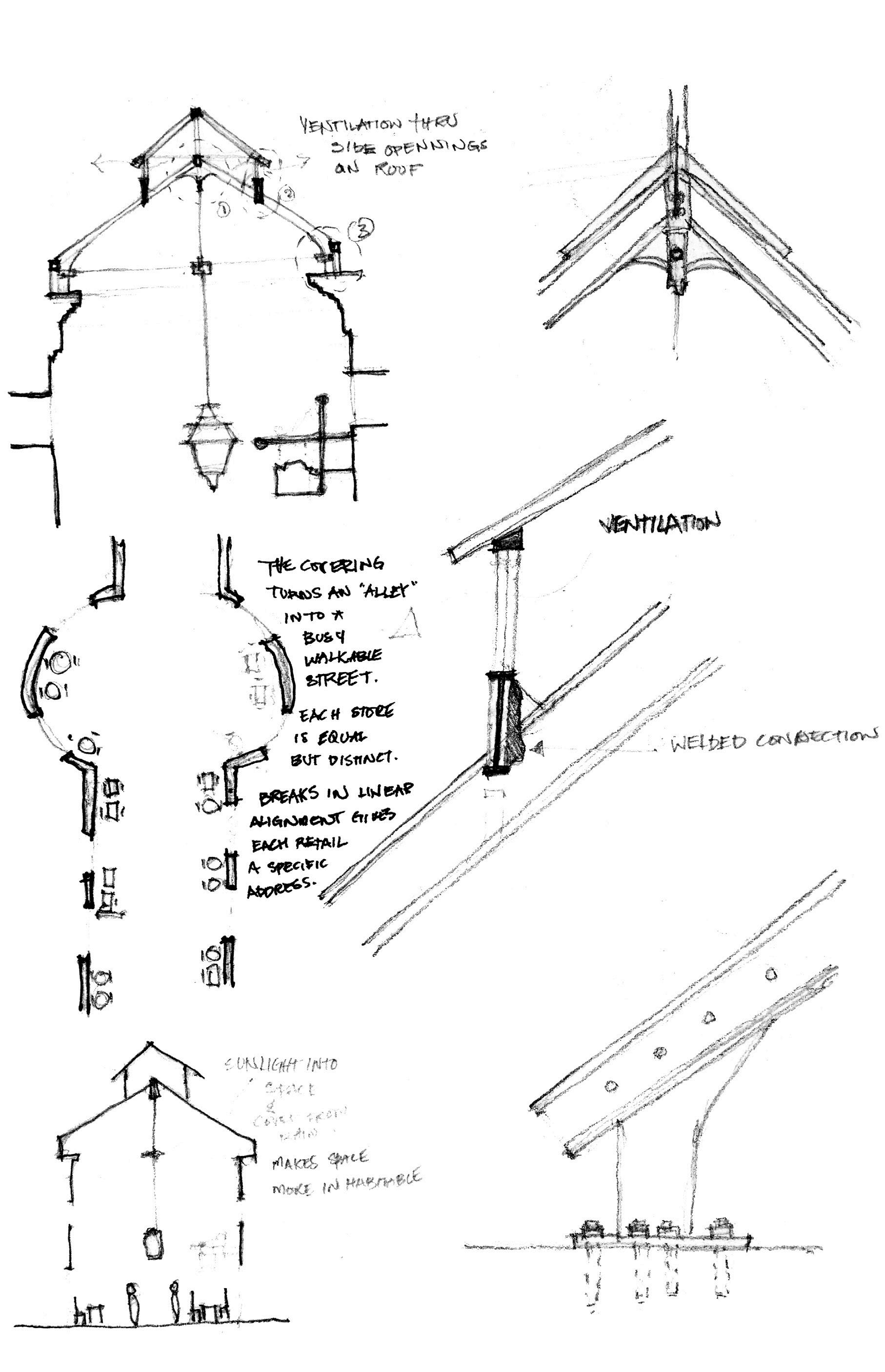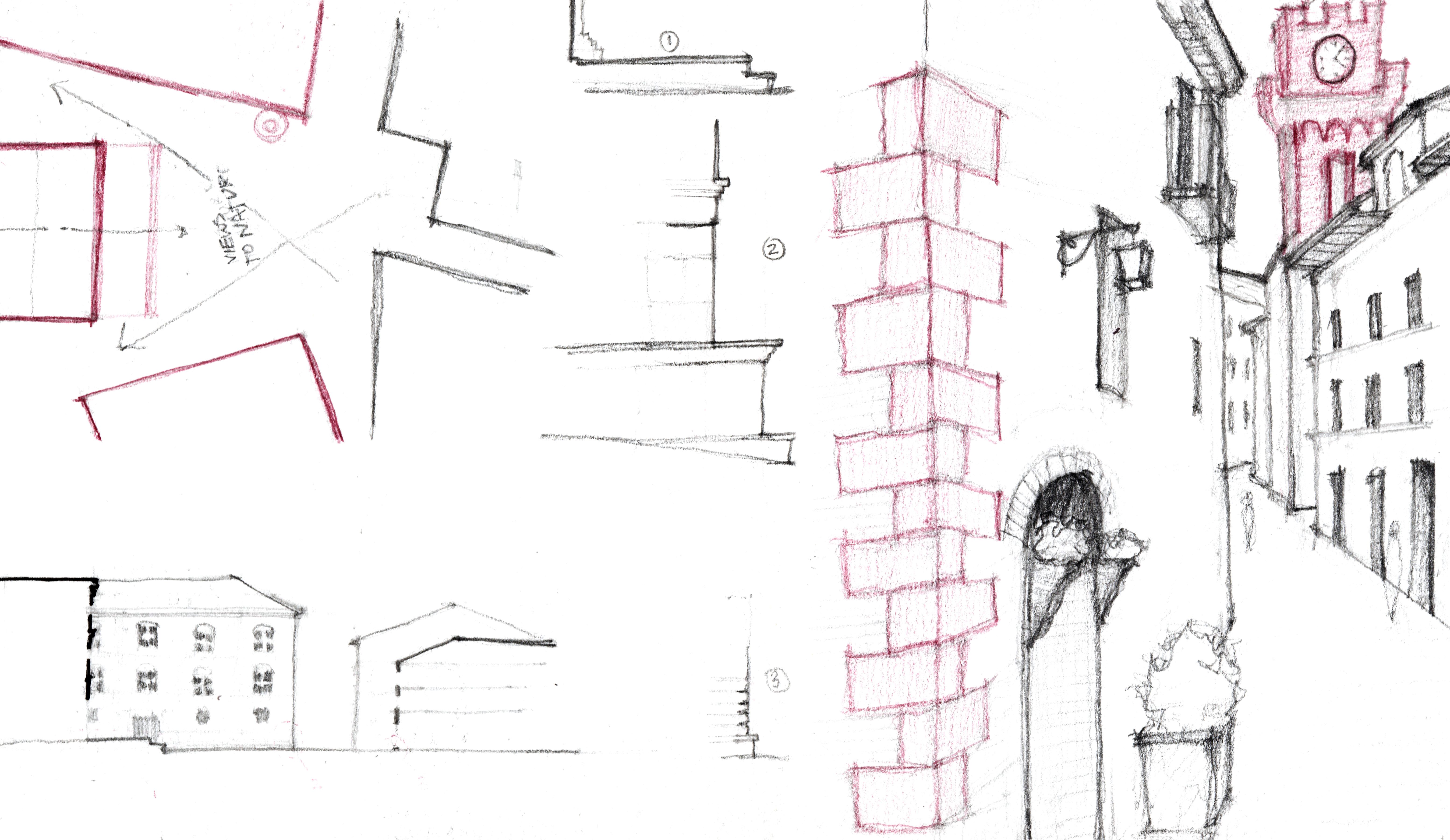 The sketches in this section are some of those done while I was there. These sketches analyze and note various conditions, conventions, architectural elements and details saw while on the tour.