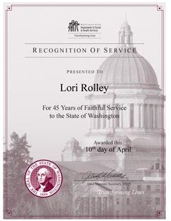 On April 10, 2023, Lori Rolley received a recognition of service for 45 years of faithful service to the State of Washington.