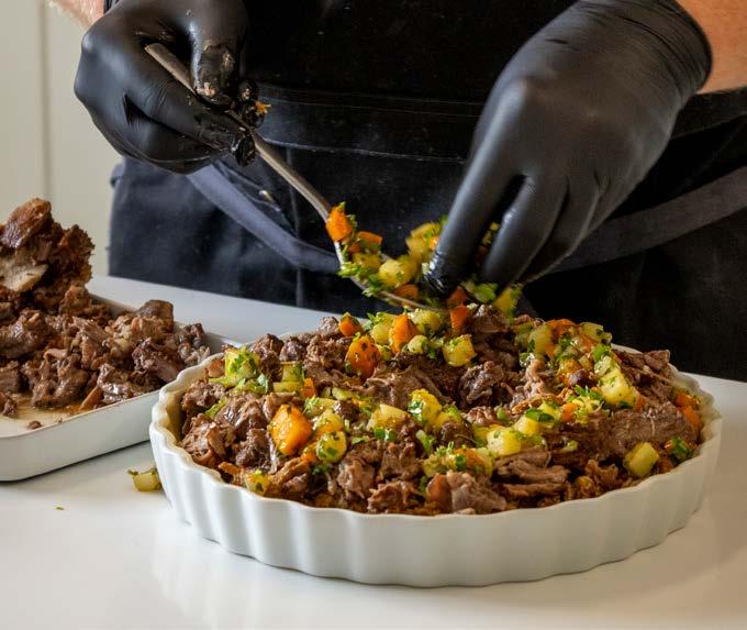 • Hæld oksehalerne op i en sigte og pil kødet fra benet og vend det med rodfrugterne og den hakkede persille.