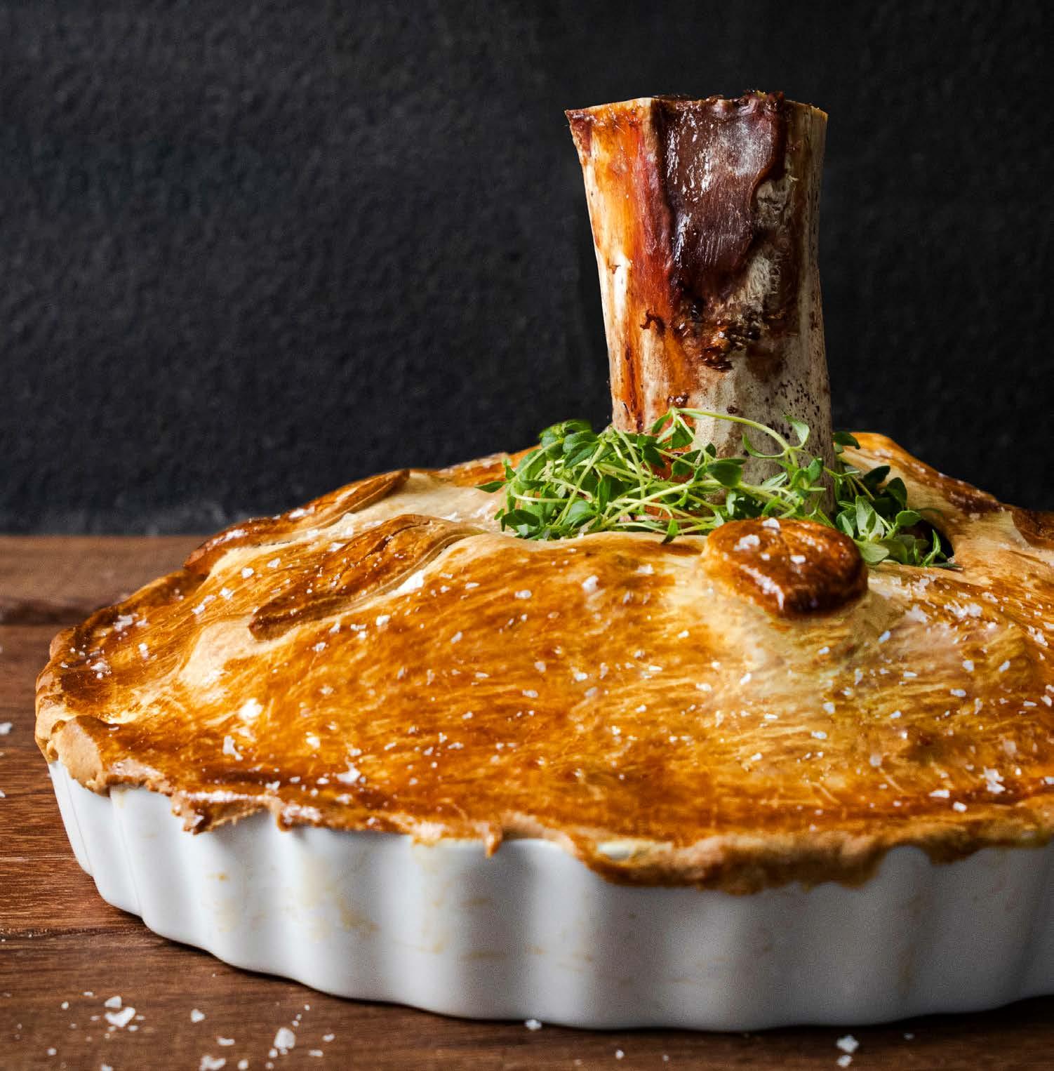 • Tærtedejen fordeles i et tærtefad og de braiserede oksehalefyld fordeles i fadet, læg et dejlåg over fyldet og pensle det med et sammenpisket æg. I midten skæres i hul som marvbenet kan stå oprejst i. Tærten bages gylden og lækker i 30 minutter ved 200°C.