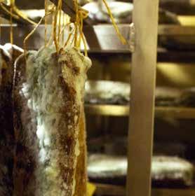 Fratelli Corra benytter dyr fra udvalgte avls bedrifter i området. Noget, der er typisk for lokale kvæg, er det lange ophold i græsgange i løbet af sommeren på det alpine græs. Svi nene, der bruges til speck og andre af virk somhedens produkter, udvælges også nøje i området, og disse svin er noget større end dem, vi kender fra Danmark. Her slagtes svi nene først, når de vejer mellem 170 og 180 kilo – ja de kan veje helt op mod 300 kilo. Det giver en skinke på mellem 16 og 20 kilo. Italiensk svineproduktion er netop karakteri seret ved, at over 85 procent af svinekødet stammer fra tungsvin over 150 kg. Et spændende besøg hos en meget lokal slagter, der stolt viste sit håndværk og sine produkter frem. Som afslutning på besøget fik vi naturligvis lov til at smage på de lækre produkter.