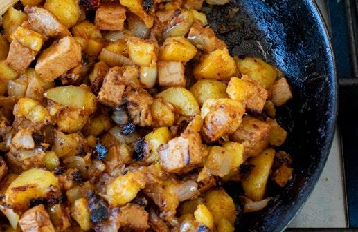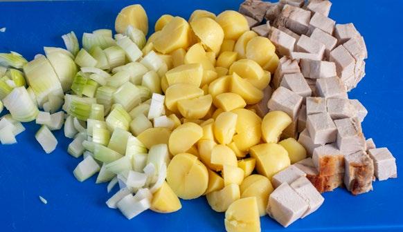 Skær de kogte kartofler i små tern. Skær kødet i tilsvarende små tern. Pil skalotteløg og snit dem fint. Steg løget let i smør eller olivenolie på en stor pande til det er klart og næsten gennemsigtigt. Tilsæt kartoflerne og lad dem stege med til de er gyldne og sprøde. Vend kødet i og varm biksemaden godt igennem.