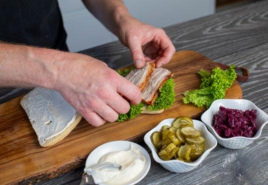 Smør bollen med salatmayonnaise og saml sandwichen med salatblade, skiver af ribbenstegen, salt, syltede agurk i skiver og rødkål.