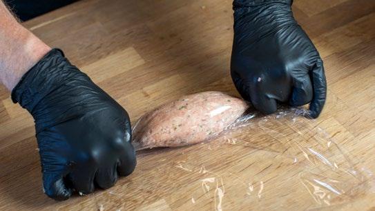 Del farsen i fire portioner og form det rundt om porrestykkerne. Rul dem ind i madfilm og luk dem tæt i enderne, sørg for at rulle dem dobbelt, for at være sikker på, at de er lukket tæt.