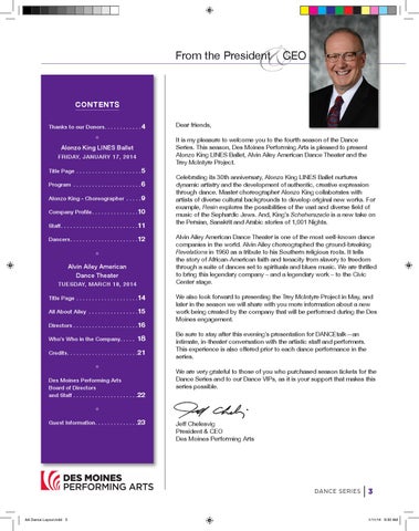 Dear friends, It is my pleasure to welcome you to the fourth season of the Dance Series. This season, Des Moines Performing Arts is pleased to present Alonzo King LINES Ballet, Alvin Ailey American Dance Theater and the Trey McIntyre Project. Celebrating its 30th anniversary, Alonzo King LINES Ballet nurtures dynamic artistry and the development of authentic, creative expression through dance. Master choreographer Alonzo King collaborates with artists of diverse cultural backgrounds to develop original new works. For example, Resin explores the possibilities of the vast and diverse field of music of the Sephardic Jews. And, King’s Scheherazade is a new take on the Persian, Sanskrit and Arabic stories of 1,001 Nights. Alvin Ailey American Dance Theater is one of the most well-known dance companies in the world. Alvin Ailey choreographed the ground-breaking Revelations in 1960 as a tribute to his Southern religious roots. It tells the story of African-American faith and tenacity from slavery to freedom through a suite of dances set to spirituals and blues music. We are thrilled to bring this legendary company – and a legendary work – to the Civic Center stage. We also look forward to presenting the Trey McIntyre Project in May, and later in the season we will share with you more information about a new work being created by the company that will be performed during the Des Moines engagement. Be sure to stay after this evening’s presentation for DANCEtalk—an intimate, in-theater conversation with the artistic staff and performers. This experience is also offered prior to each dance performance in the series. We are very grateful to those of you who purchased season tickets for the Dance Series and to our Dance VIPs, as it is your support that makes this series possible.