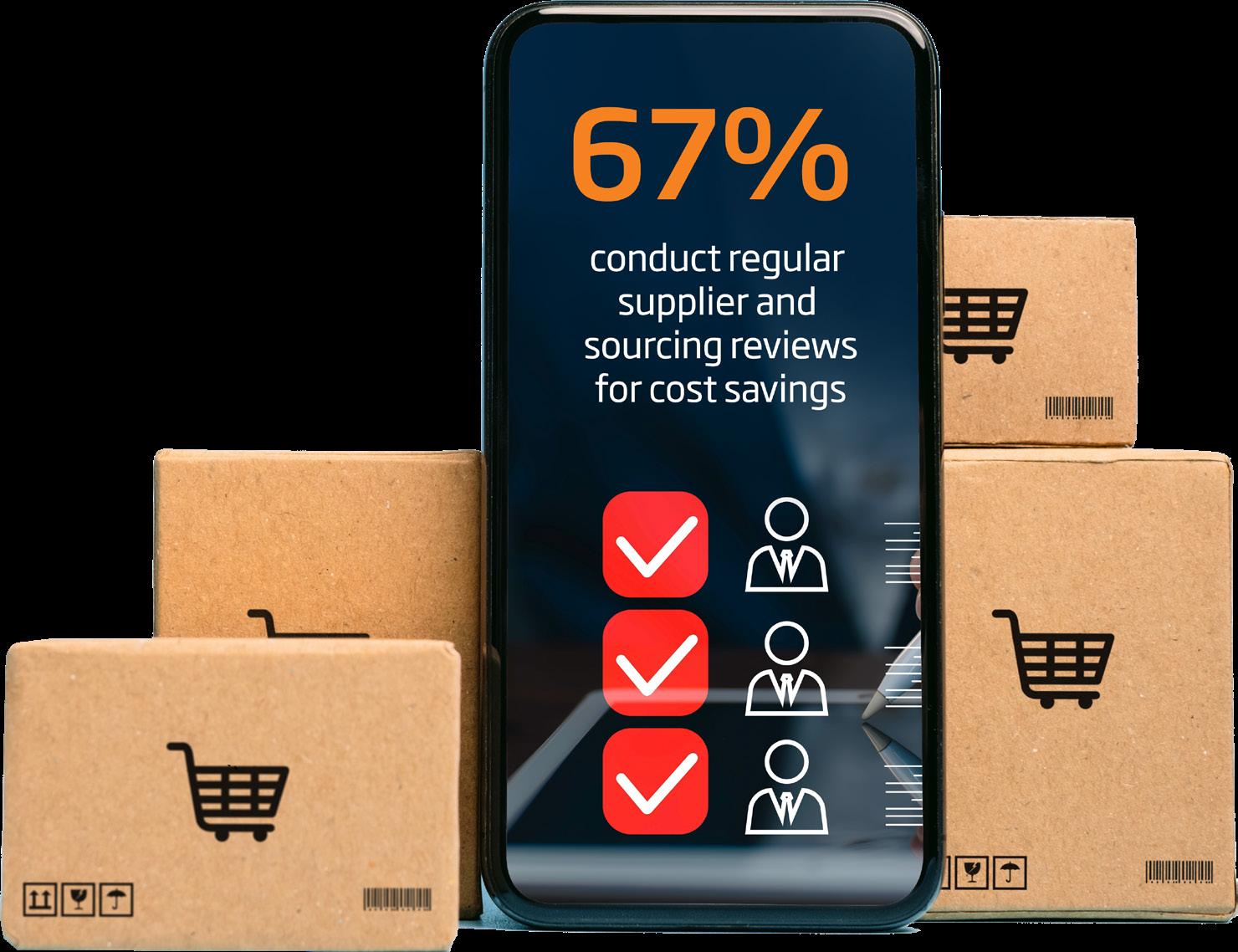 The survey reveals that 65% conduct regular supplier and sourcing reviews for cost savings, and 59% use third-party logistics to reduce overhead costs and warehousing estate.