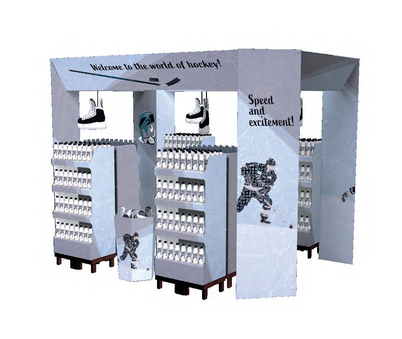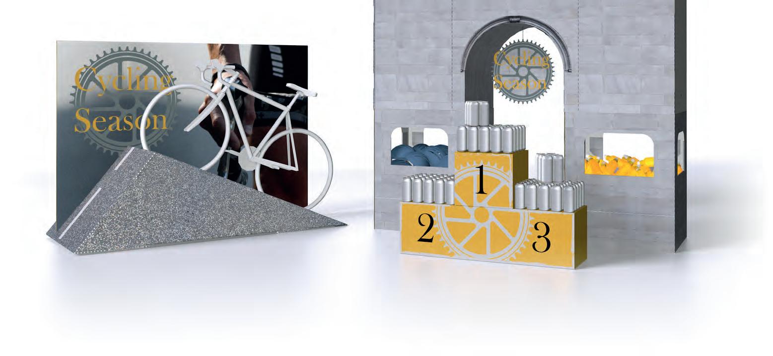 Simple but effective arc lifts the appearance of ordinary stacked product cases. The signage on the sides of the stacked product columns is emphasised by an arc added on top.