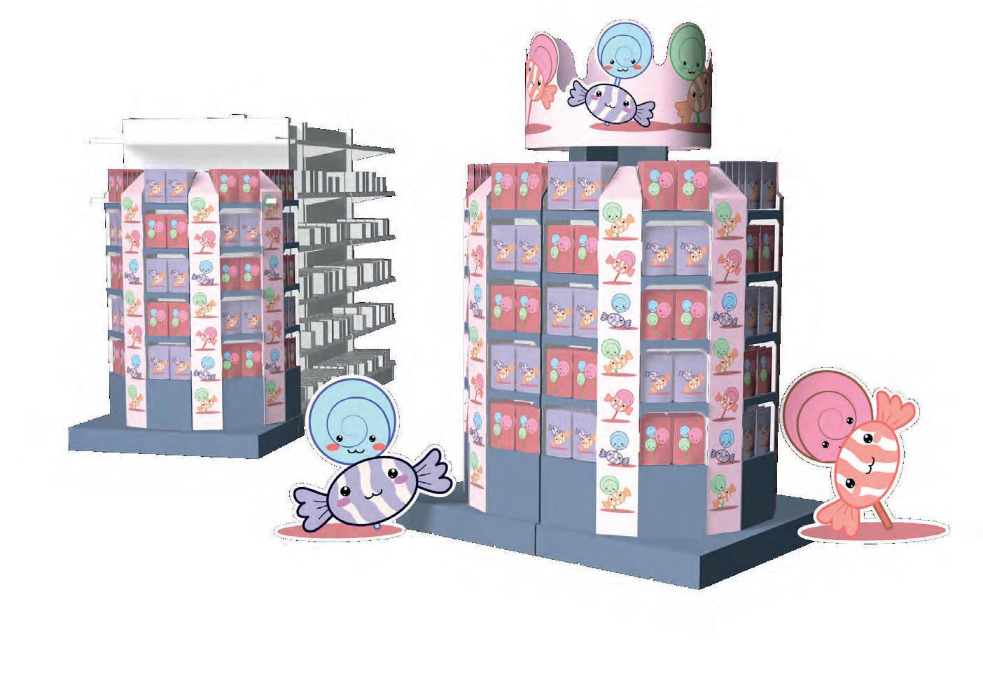 One pallet unit can be used in an endcap position. Alternatively, two units placed back-toback with a top piece creates an impactful 360 degree candy
