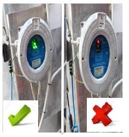 Der Fahrer überprüft das Vorhandensein des grünen Lichts auf der Erdungsanzeige, dass die korrekte Positionierung der Klemme und damit die Erlaubnis zum Entladen bestätigt.Bleibt das rote Licht an, ist das Entladen nicht erlaubt. Erdungsanschluss