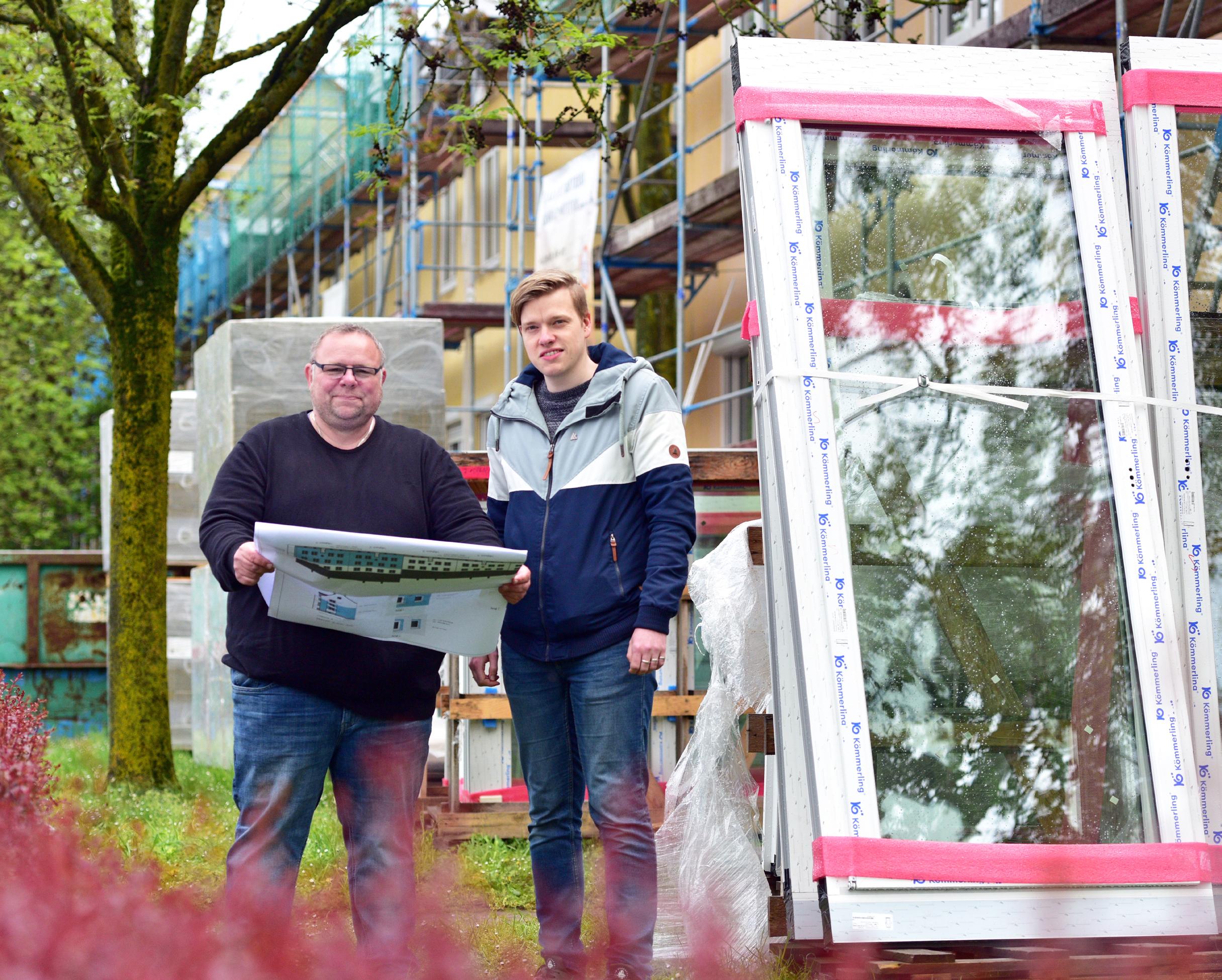„Das alles kommt natürlich auch der Wohnqualität und vor allem den Geldbörsen unserer Mieter*innen zugute. Denn in Wohnungen mit einer weiter verbesserten Dämmung kann in Zukunft etwas weniger geheizt werden“, so Bauleiter Tim Haverkamp. Er betreut das in zwei Bauabschnitte untergliederte Großprojekt gemeinsam mit seinem Kollegen Tristan Neuser.