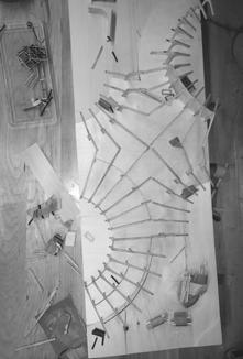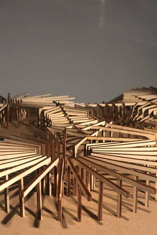 An iterative model making process guided this exploration. Digital 3D models were translated into laser cut components and assembled physically to better understand the structural system and spatial relationships. Multiple attempts were made to develop a spiral beam system that could successfully generate gathering spaces at the intersections of the structural arcs.