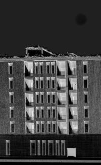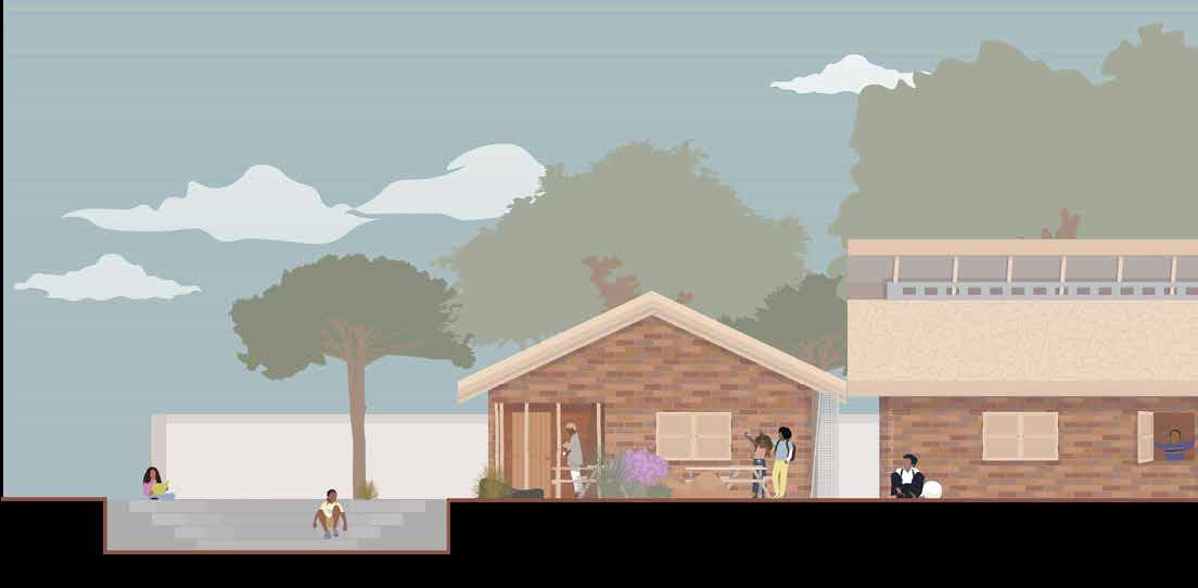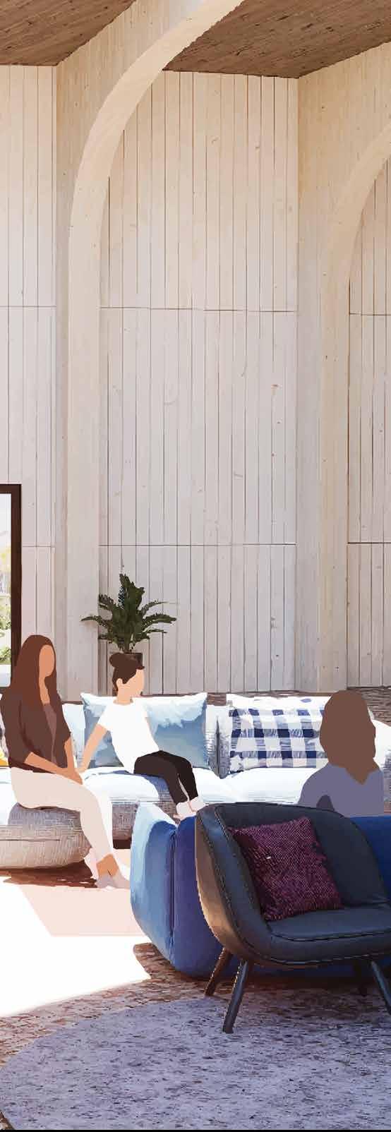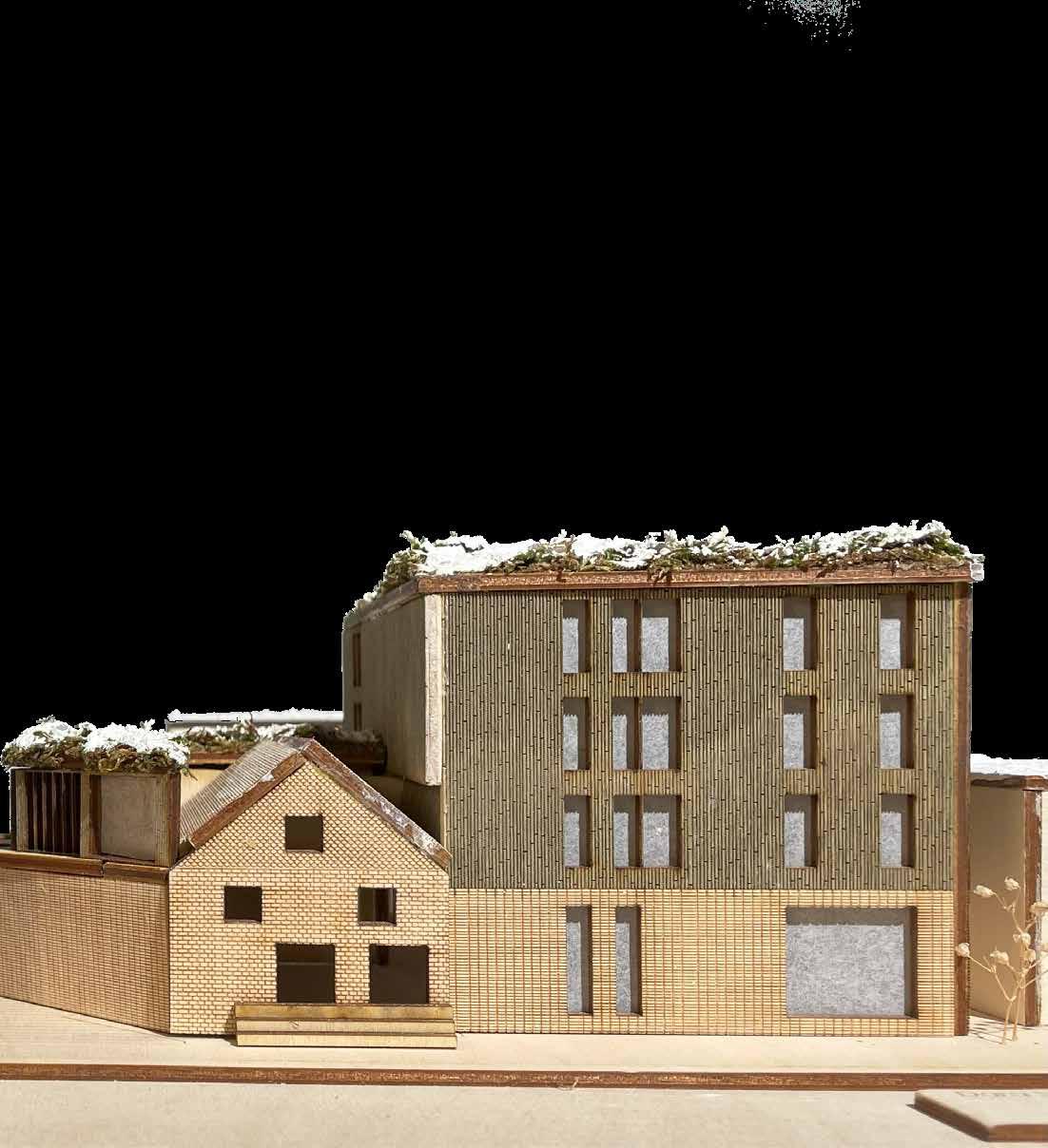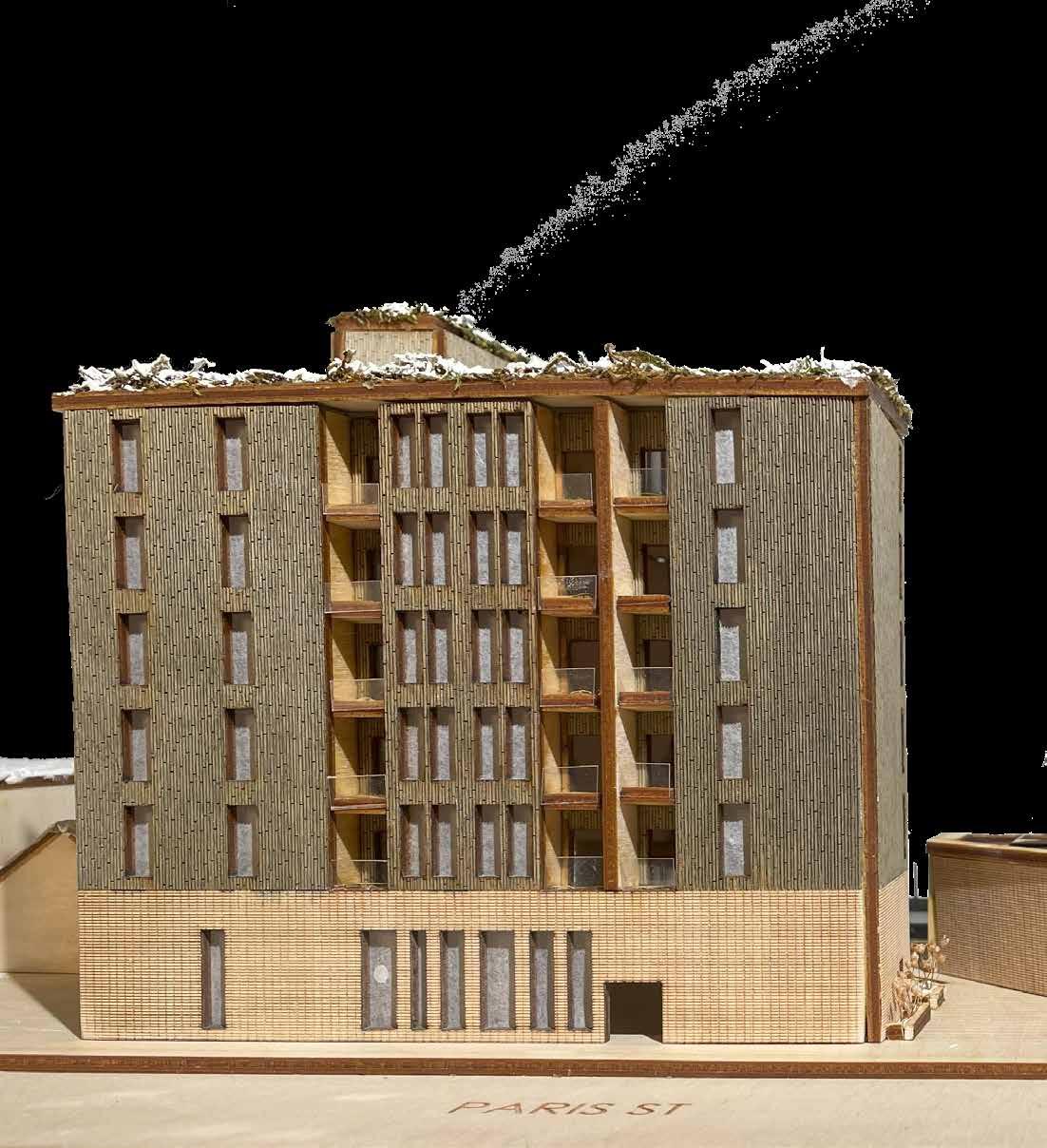 concrete composite floor assemblies, allowing exploration of largescale mass timber construction. The project examined how different cladding systems, including brick and wood paneling, connect to the primary structure and how these connections influence wall assembly design.