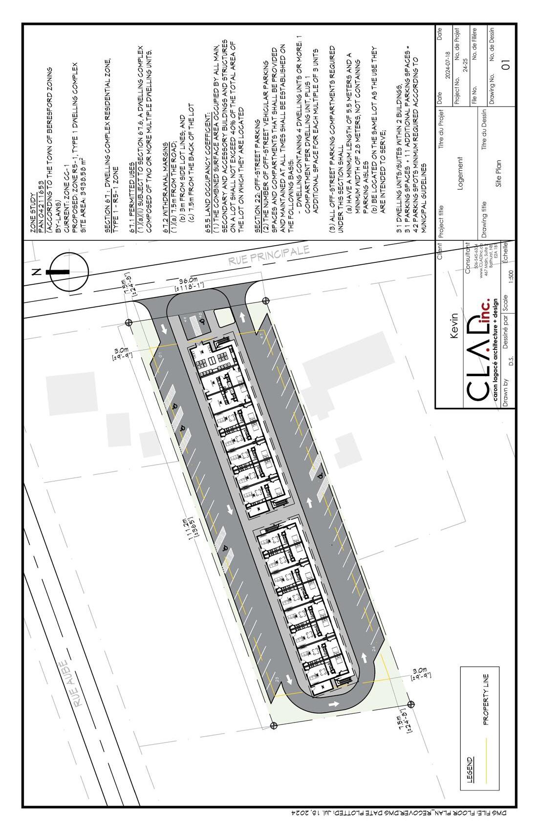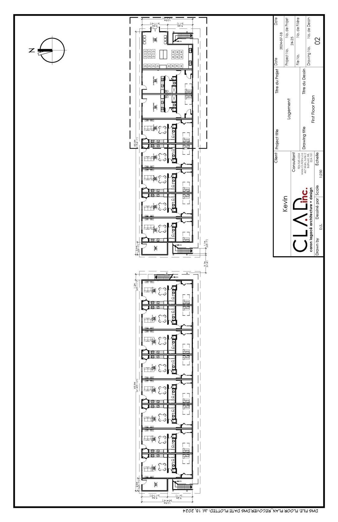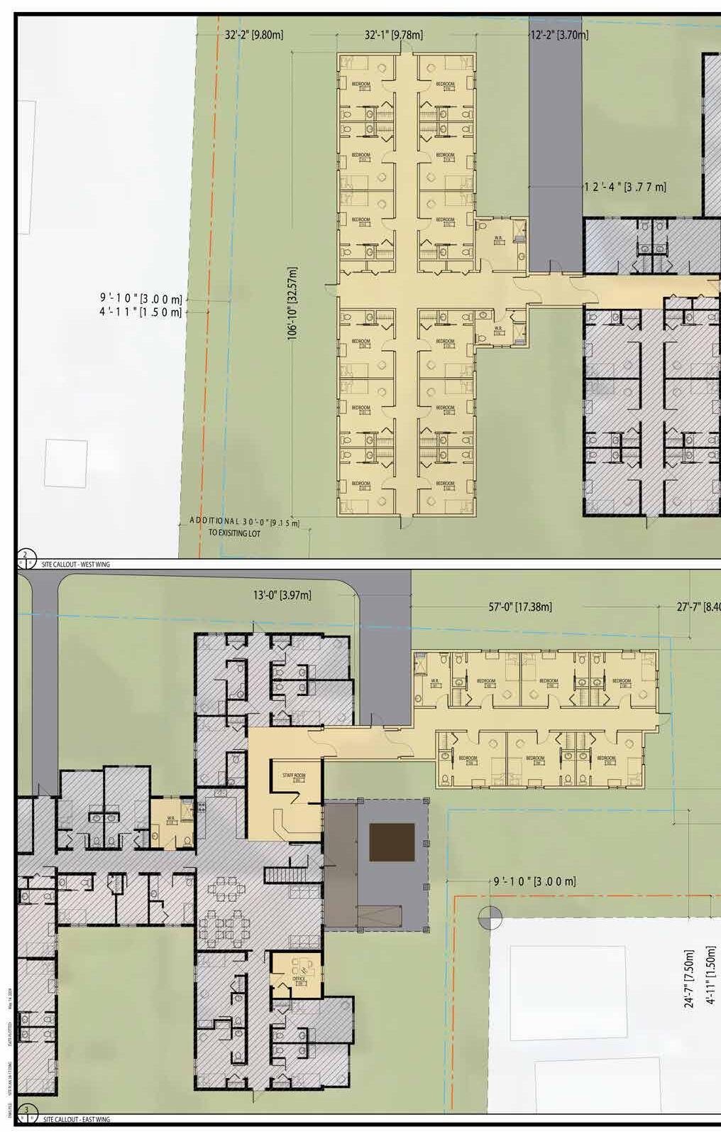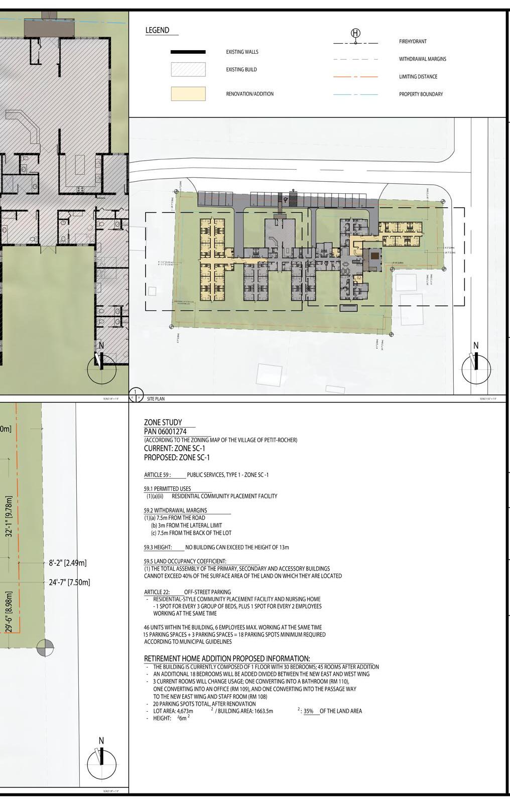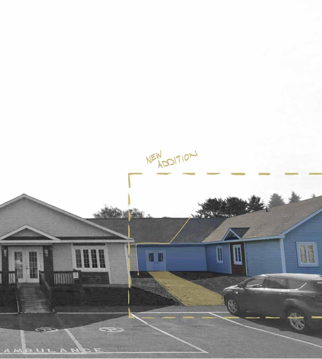 This project is a proposal for two new wings to an assisted living residence in Petit-Rocher, adding 15 bedrooms to the existing facility. The recent acquisition of the adjacent lot allowed the expansion to meet setback and distance requirements while comfortably accommodating the additions. Site constraints, including existing electrical infrastructure identified through a site visit informed entrance placement and potential placement of a secondary access.Interior modifications to the existing building were minimized to control costs, with new connections repurposing select rooms. Added bedrooms and washrooms replicate the existing layouts for consistency. The project required detailed review of local bylaws to determine appropriate building placement on the site.