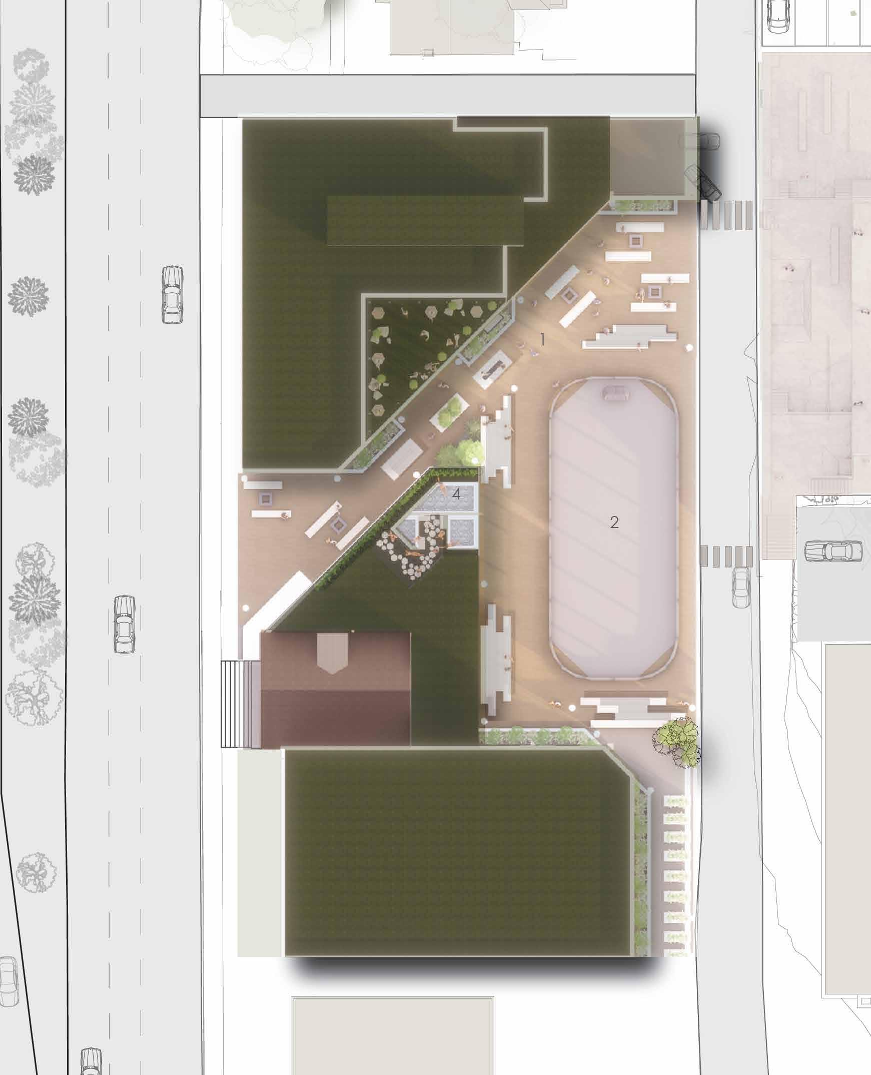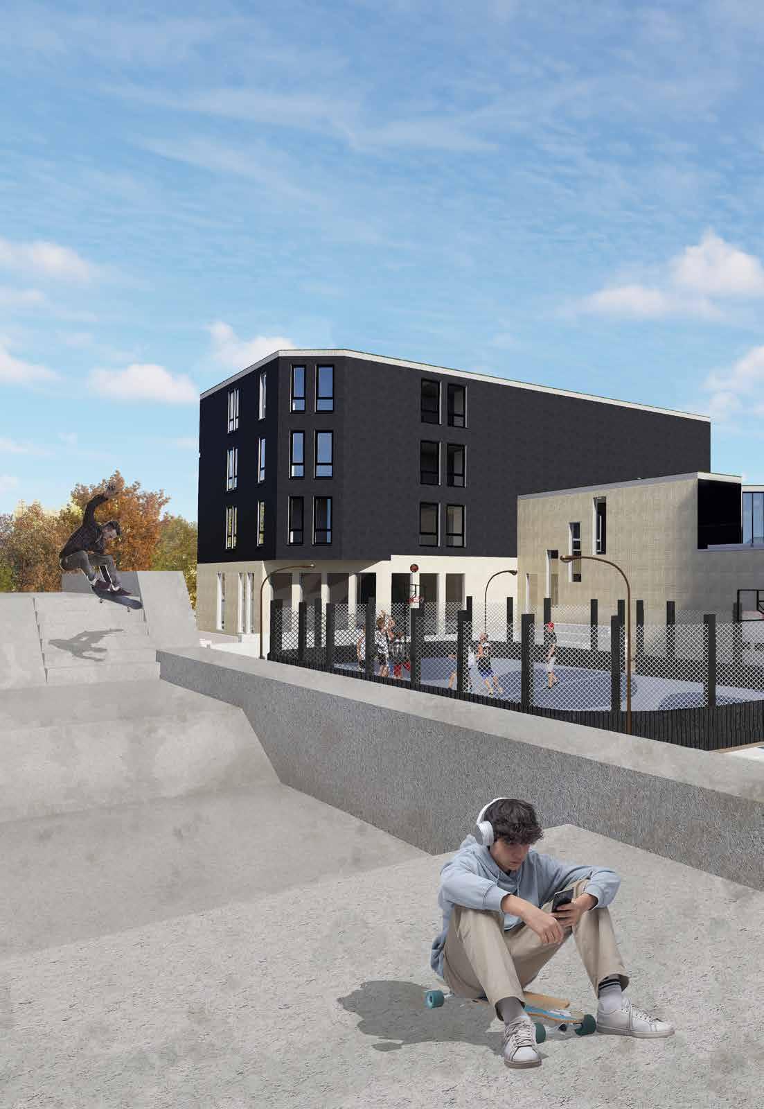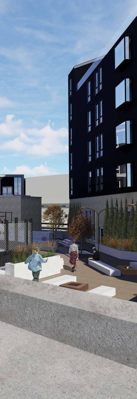 This mixed use development targets students and young adults, combining 79 residential beds with ground floor commercial spaces including a grocery, café, and wellness sauna. Two parallel buildings frame active urban spaces such as a skatepark, hockey and basketball court, and rooftop patios, encouraging community interaction. Residential units vary from studios to four bedroom layouts, while structural systems using mass timber (CLT and glulam) and concrete cores support efficient modular design. Thoughtful integration of shared spaces balances privacy, accessibility, and connection to the surrounding downtown environment.