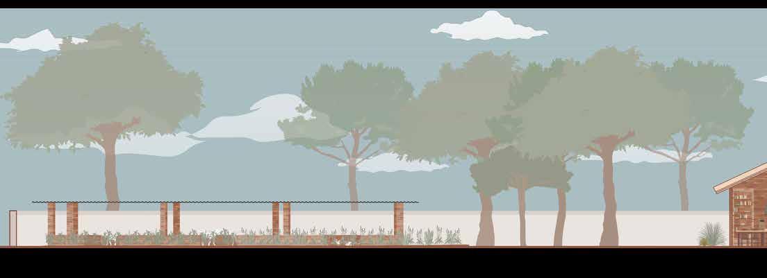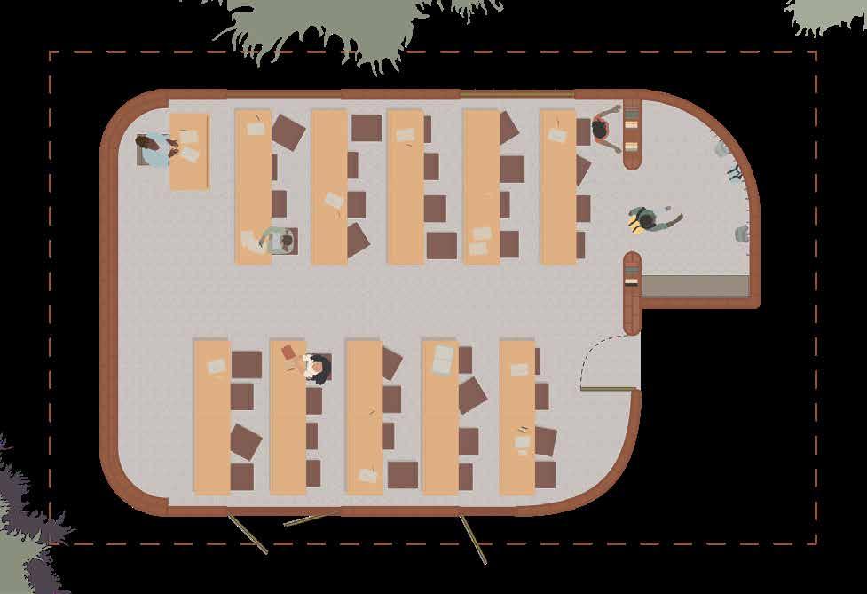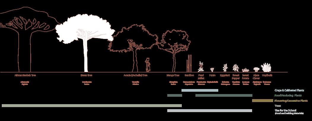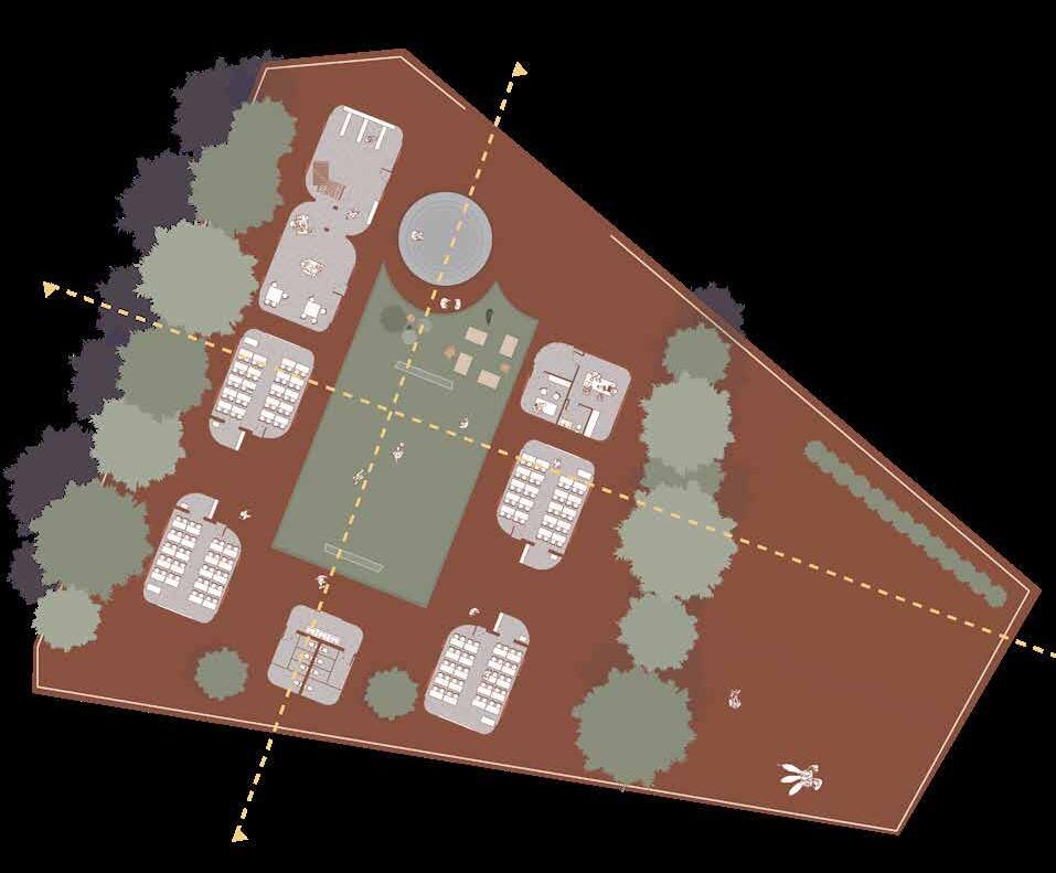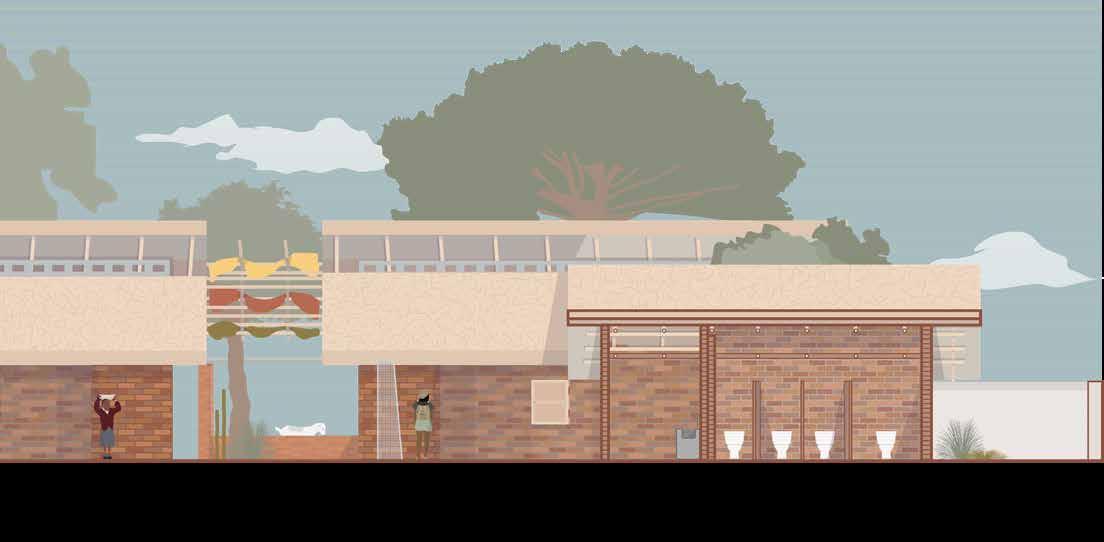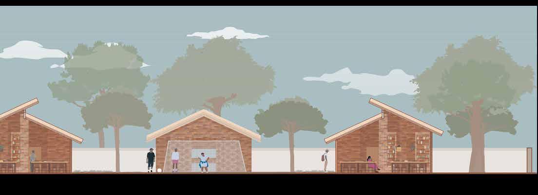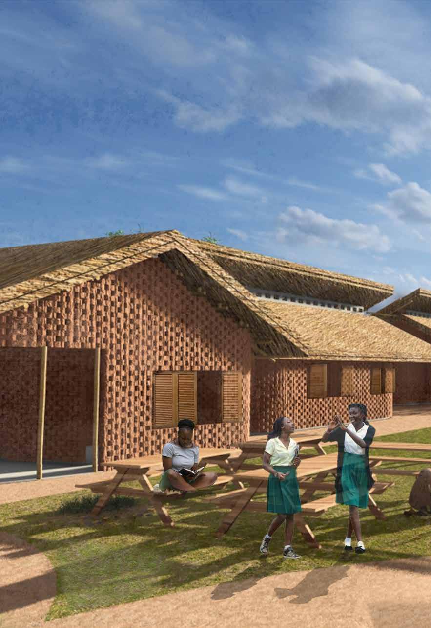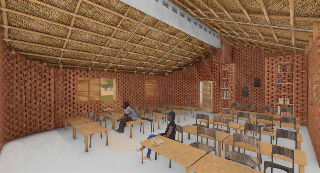 The project proposes a modular school designed in direct response to climatic conditions of Senegal. The buildings are organized around a central courtyard and conversaion pit which enhances the passive design conditions while also offering informal gathering and play spaces for students. The design prioritizes passive strategies, with thermal comfort achieved through the use of locally sourced materials such as bamboo, thatch, and adobe brick. These materials provide a high thermal mass, helping to regulate indoor temperatures and keep the classrooms cool throughout the day.