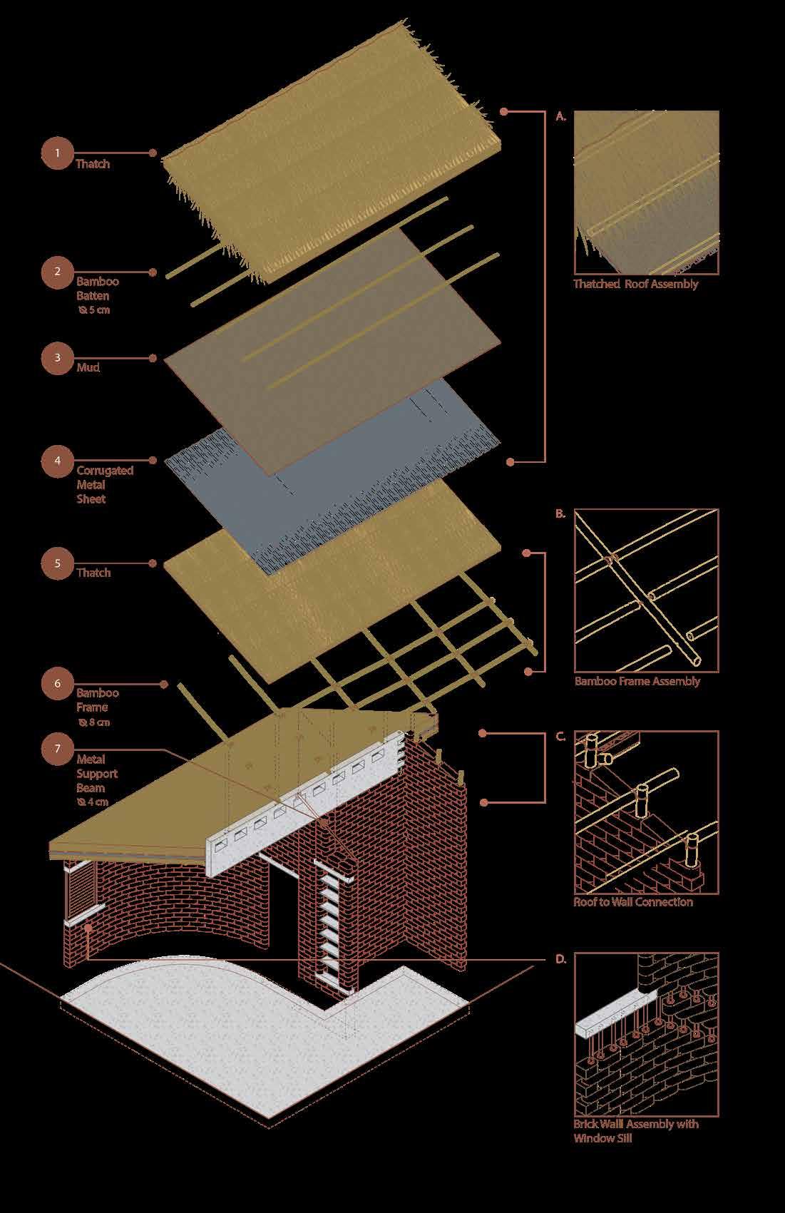 The roof is designed to be climate responsive through passive strategies that prioritize thermal comfort, shade, and natural ventilation. Rather than relying on mechanical systems, the roof improves the building’s overall performance with its insulated layering, and material composition, while protecting the interior spaces from heavy rainfall and overheating.