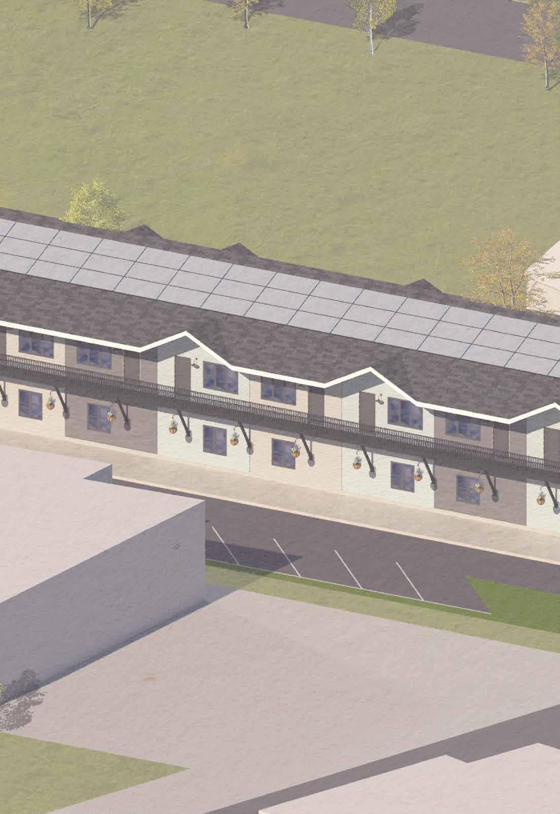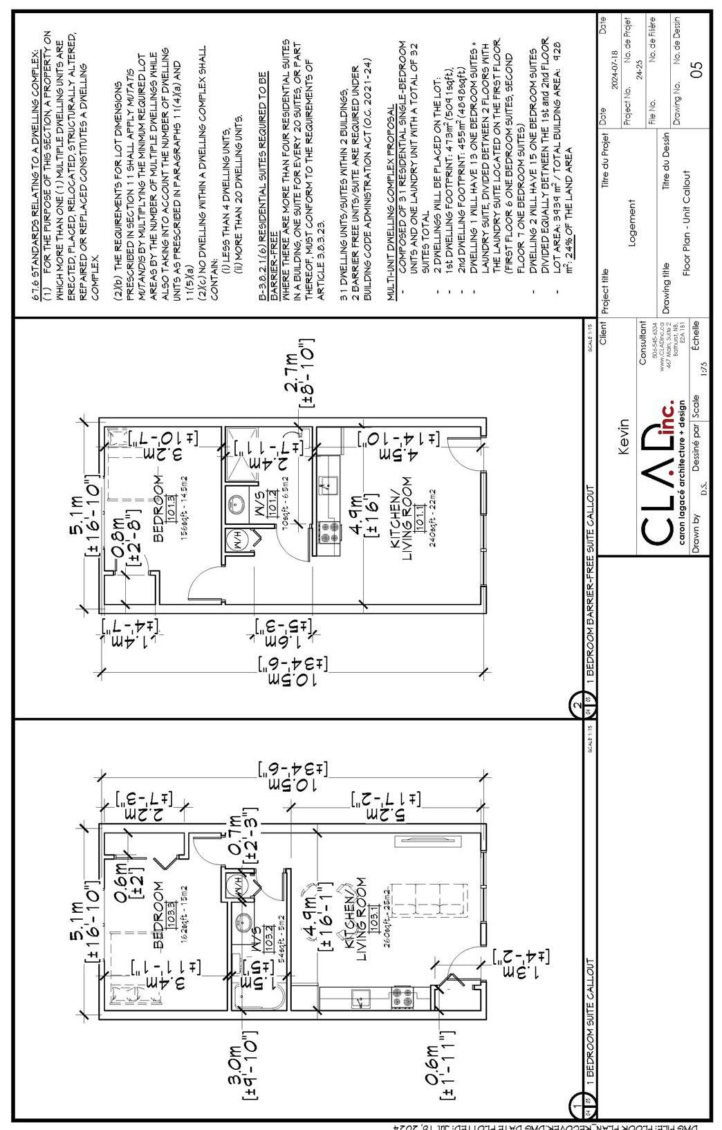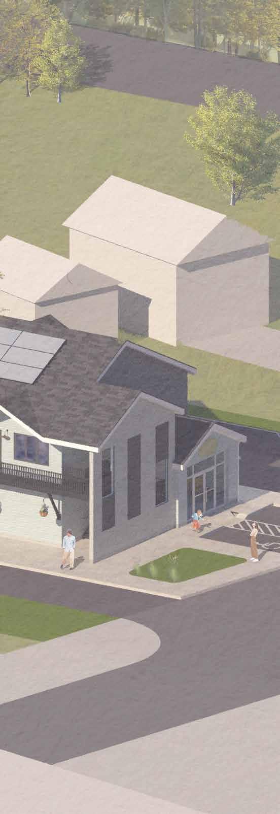 This project is a 31-unit, medium-density apartment complex designed under Part 9 of the National Building Code. All units are one-bedroom layouts, with barrier-free units located at ground level to ensure accessibility and cost efficiency. While maintaining equal square footage, barrier-free suites follow modified layouts to meet provincial accessibility requirements A shared laundry suite will serve both residents and the public, strategically positioned in relation to accessible units. Client requirements include south-facing living rooms, integrated solar panels, and a 12-foot clearance between buildings for snow removal. Exterior renderings, exploring both neutral and vibrant cladding options, were prepared for the clients approval