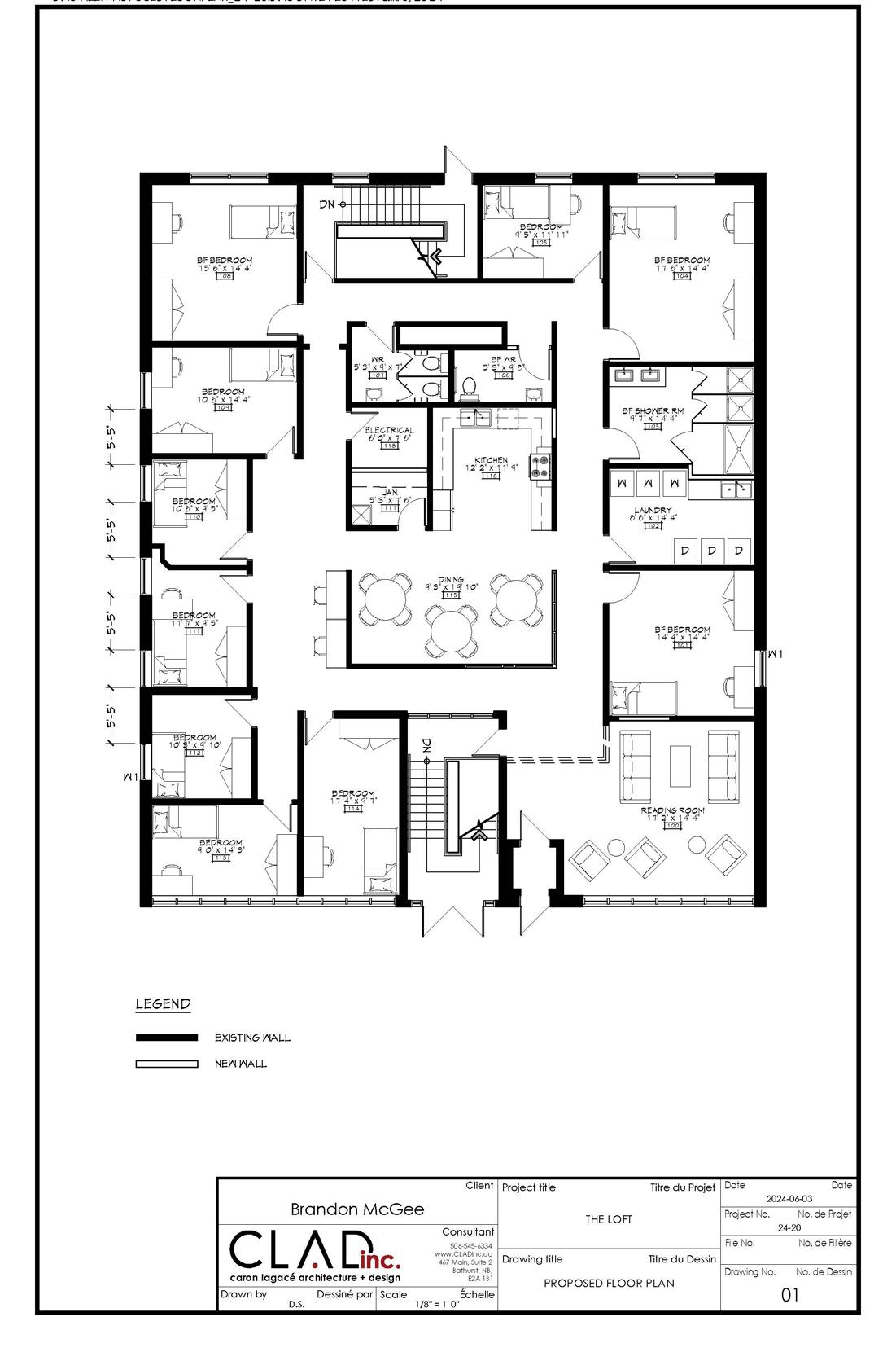 This project is an adaptive reuse of a former medical clinic on King Street in downtown Bathurst. The primary floor, previously a doctor’s office, is being converted into a dormstyle residence with private bedrooms and shared kitchen, washroom, and laundry facilities. To reduce costs, the client requested minimal alterations to existing walls. Aside from integrating a new barrier-free shower room, the layout remains largely unchanged. Code compliance required the addition of new bedroom windows where none existed. Room sizes vary due to the existing clinic layout, offering both spacious, barrierfree compliant rooms and tighter spaces with limited casework flexibility.