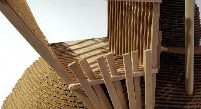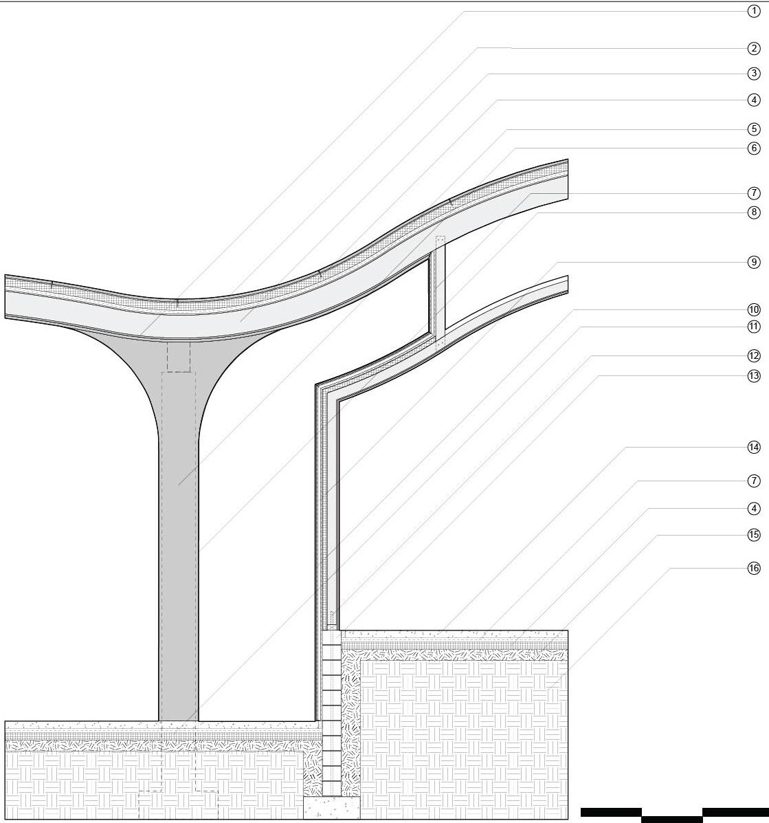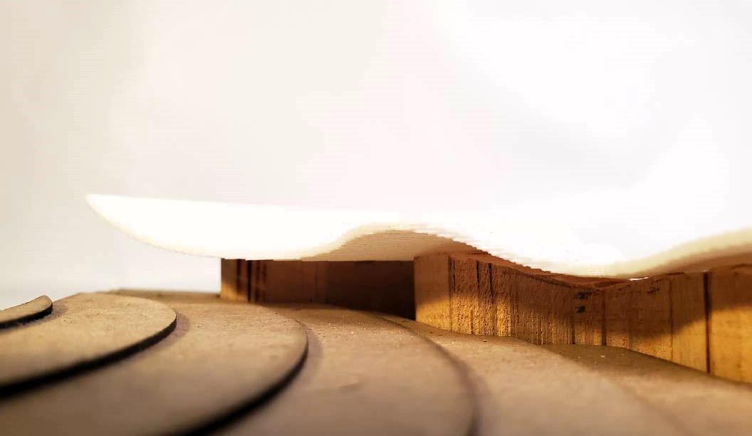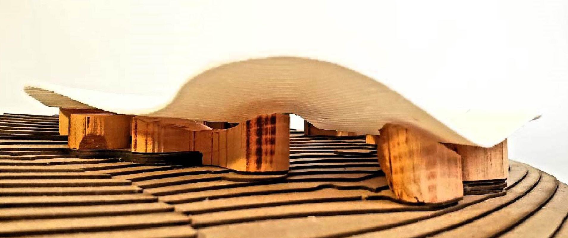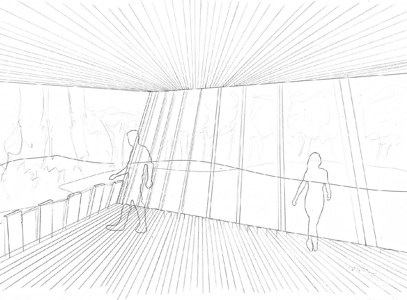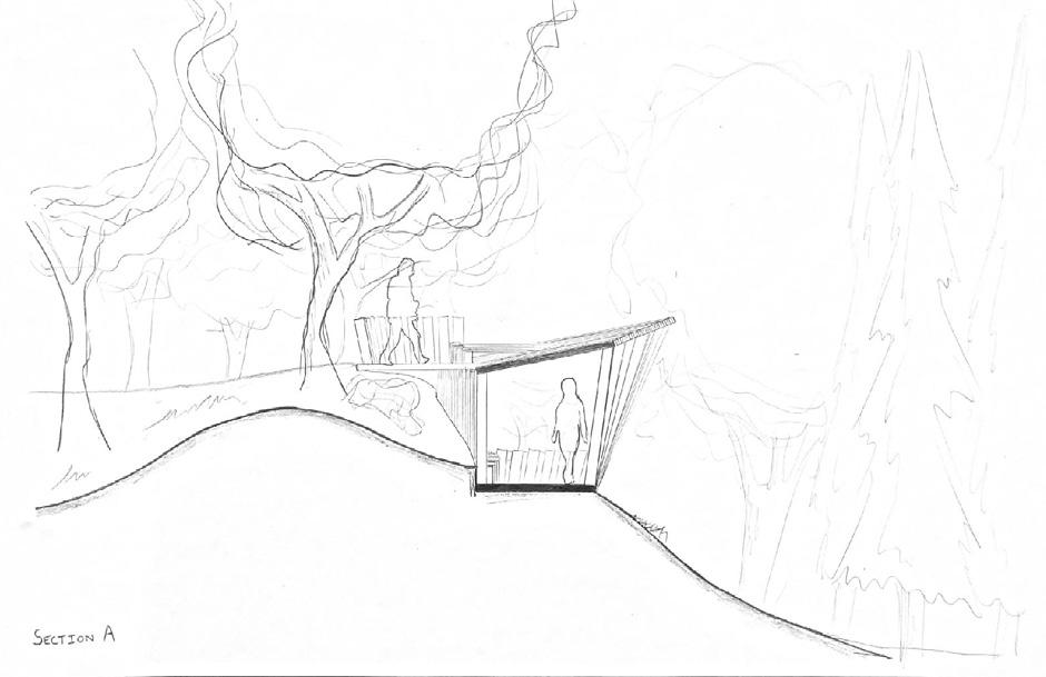 Entitled Diffraction, my pavilion carves into a sloped bank above the marshy waters of the Bay of Green Bay. Walkers on the lower trail encounter a portal that transforms their visual perception of the nature around them, while the light, sounds, and moisture still emanates in between the beams and from the closeness of the ground. Conversely, visitors on the upper trail are elevated onto the roof of the structure, gaining another new visual ground of their surrounding landscape while again being immersed amongst the feel and sounds of the tree canopies.