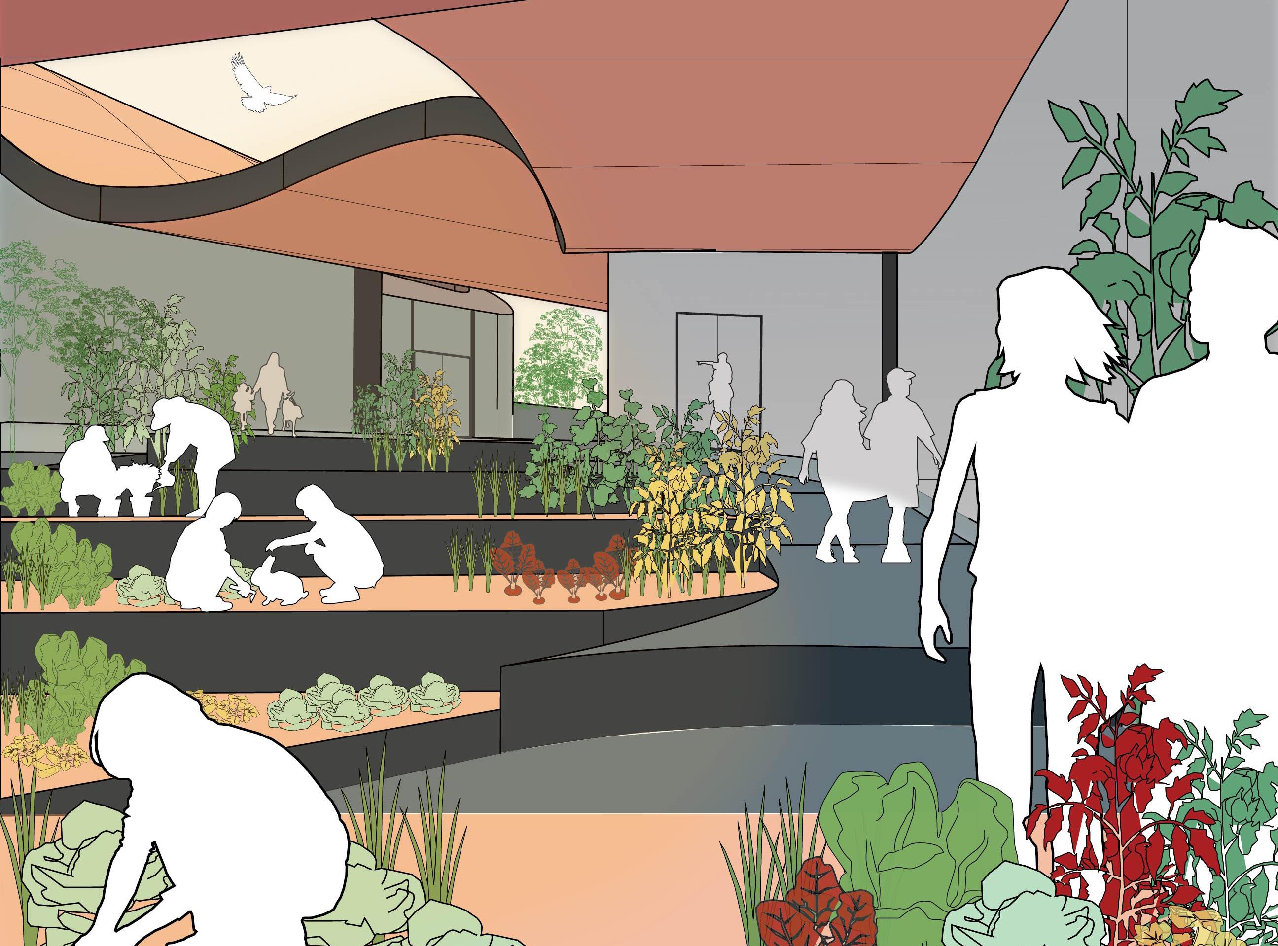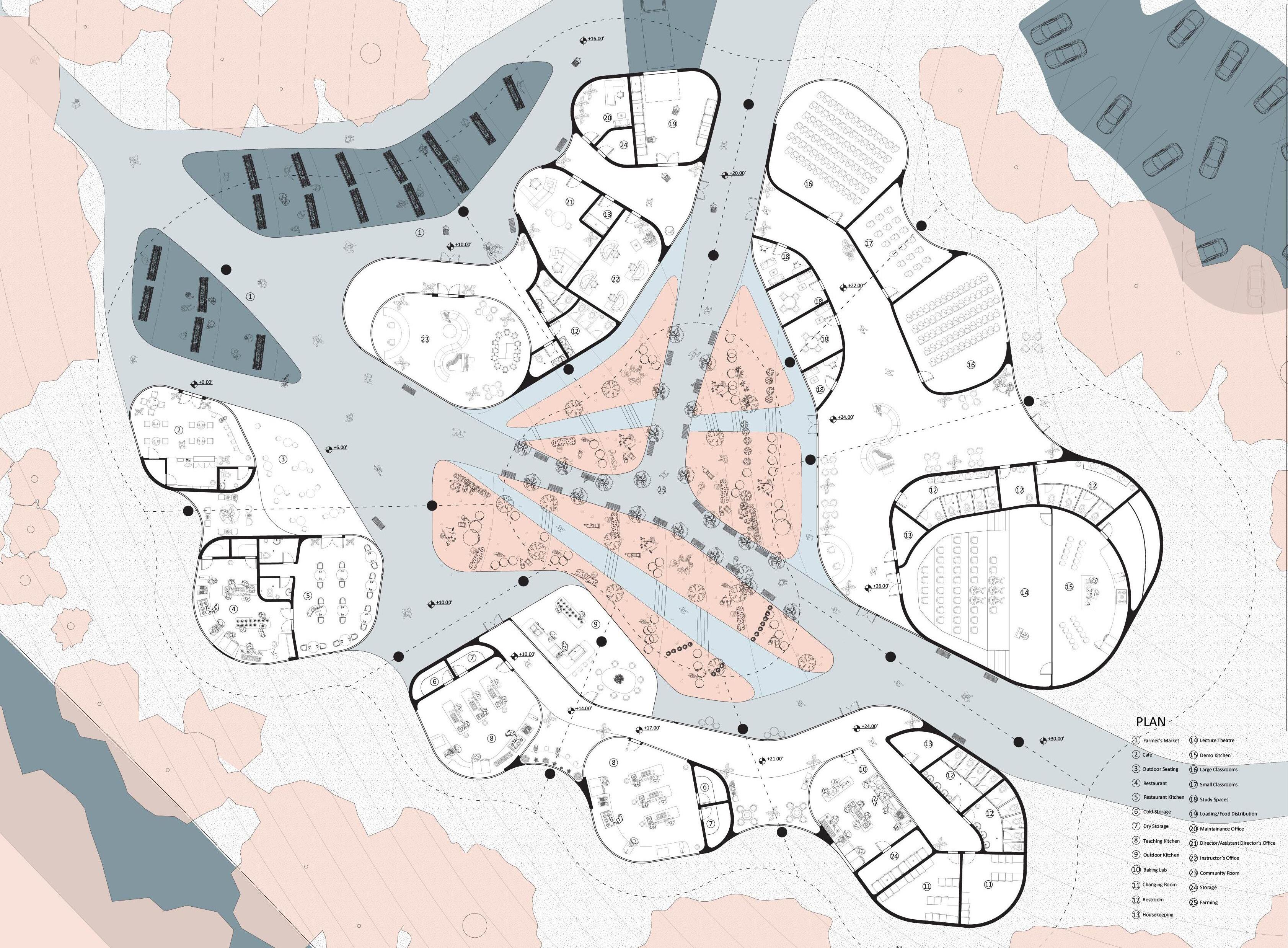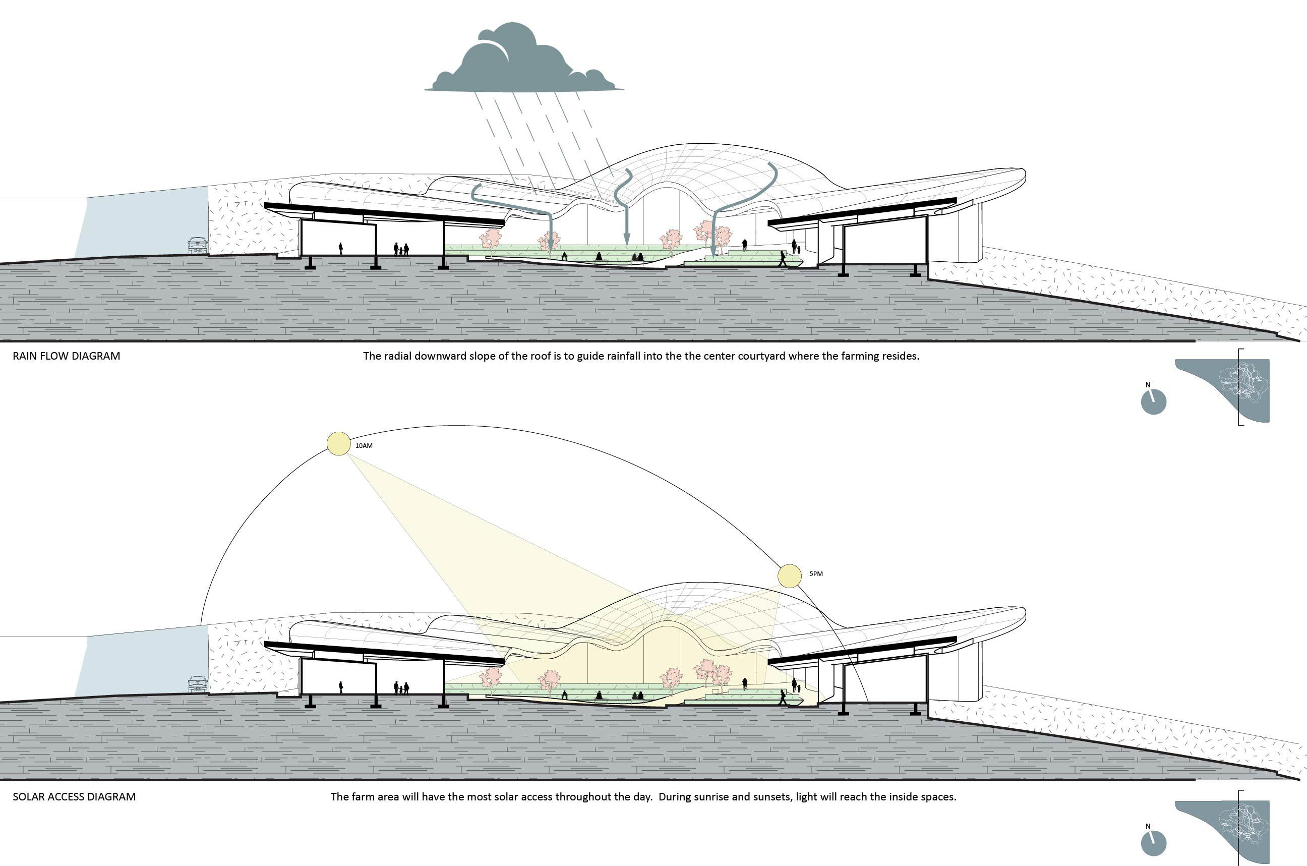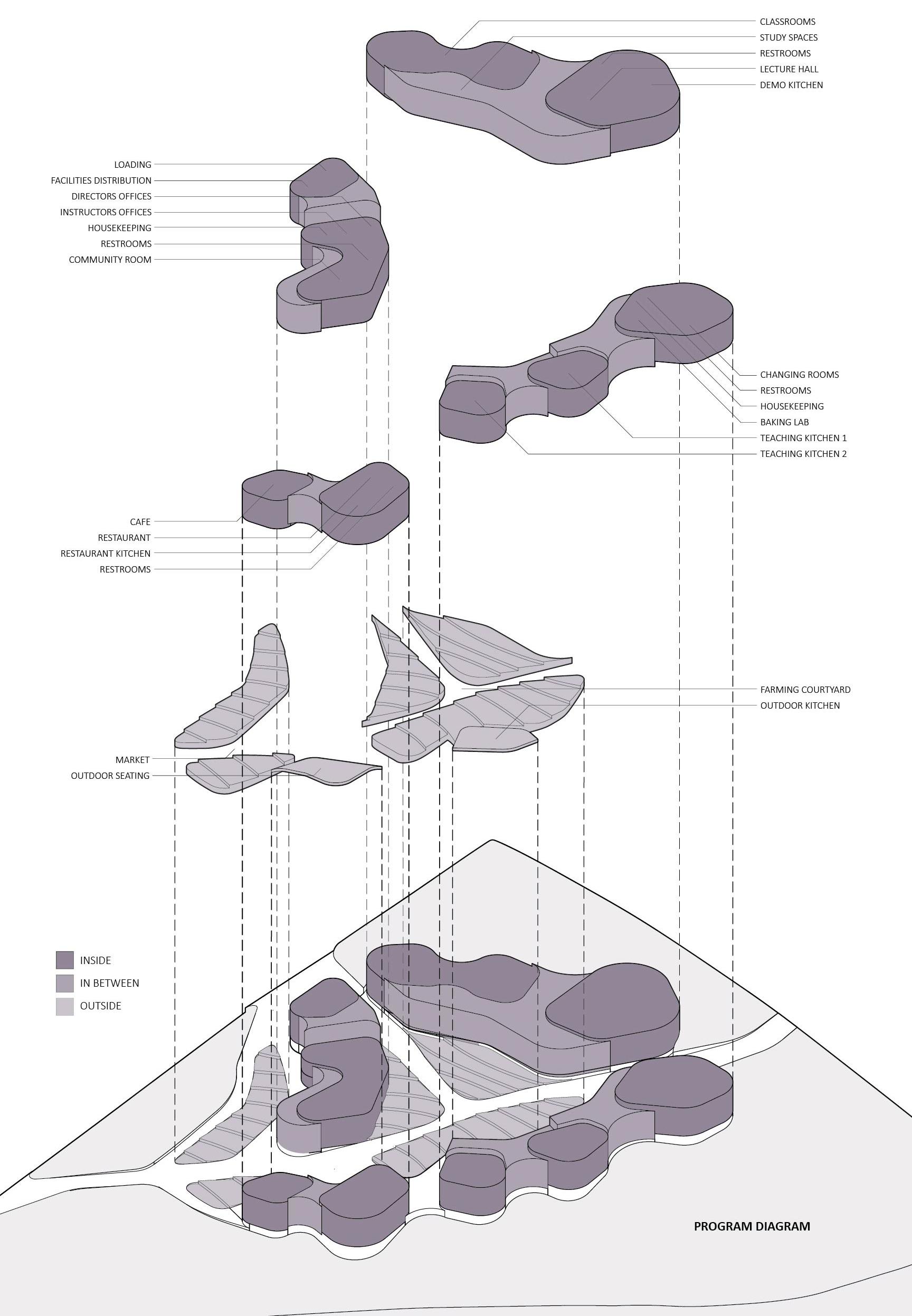 Thus, our culinary institute developed into a radial form, where the central farming courtyard cultivates an immersive learning environment connected between the students of the culinary institute and the public. The students’ classrooms and kitchens are ordered along the east side of the site according to their daily schedule, while the public is drawn to the site from the west side first to attend community farmers markets and then invited into the student courtyard. Following the curvilinear form in plan view, glass curtain walls on the inner side of the student facilities invite public discovery while students showcase their own work in the farmers markets. Mirroring the slope of the site, the roof condition resembles the cyclical, interwoven nature of this community togetherness, while also enabling the sun and water-catching features of the courtyard.