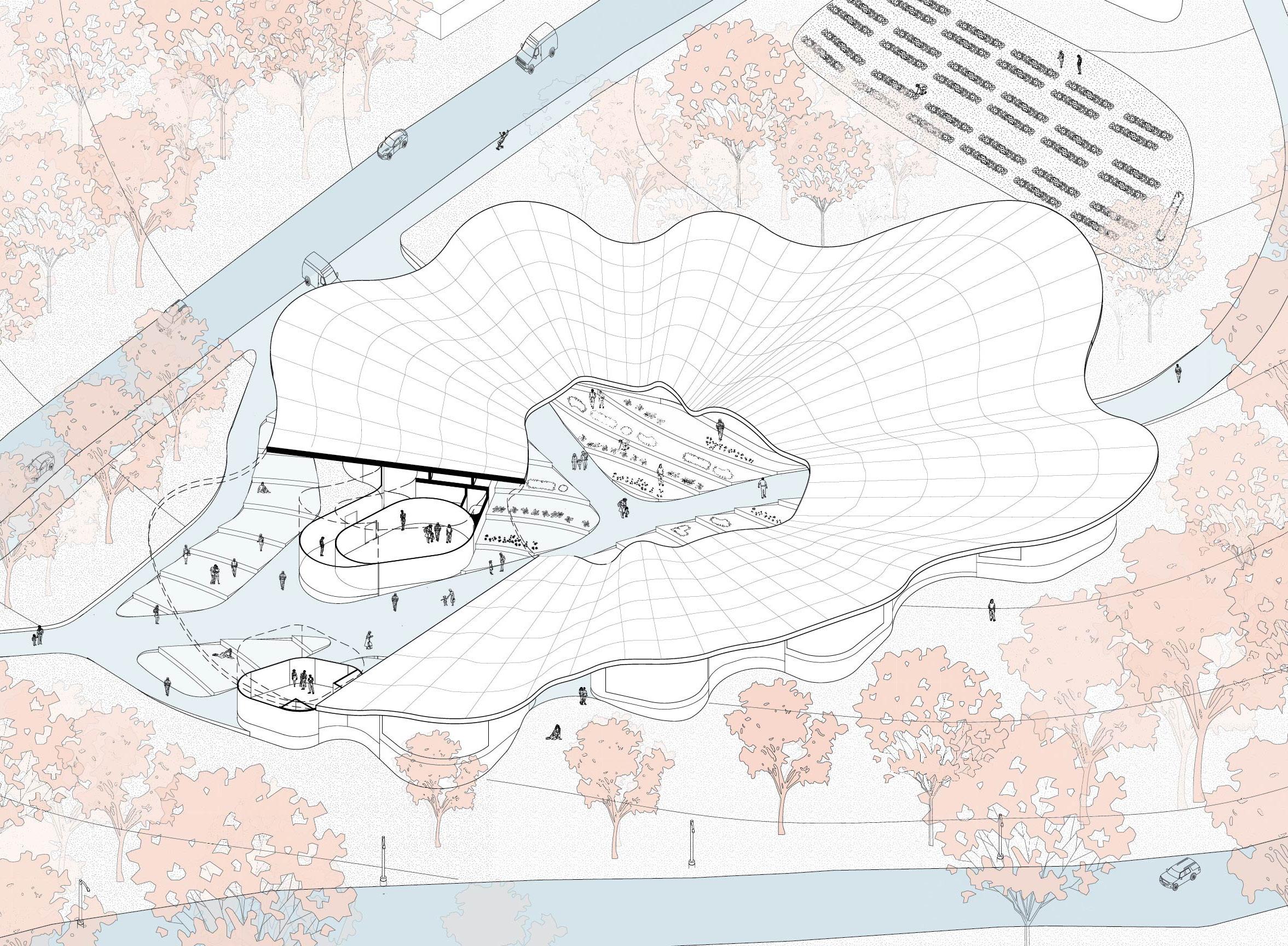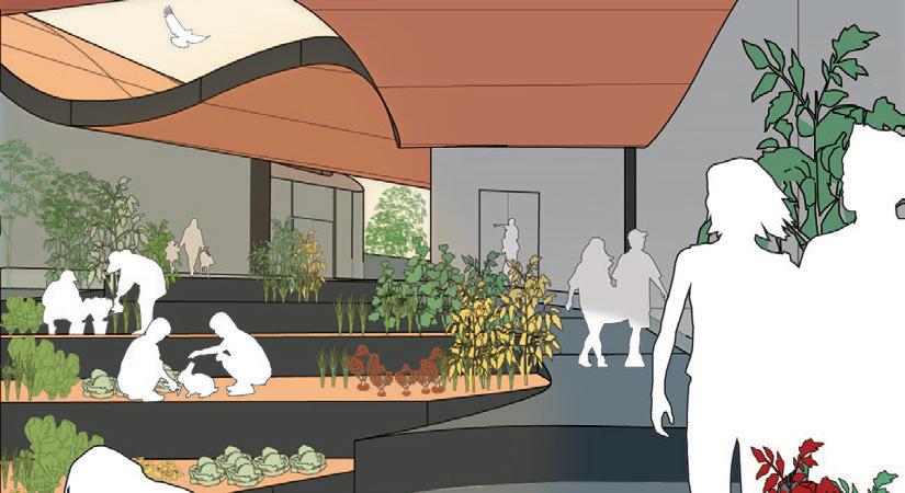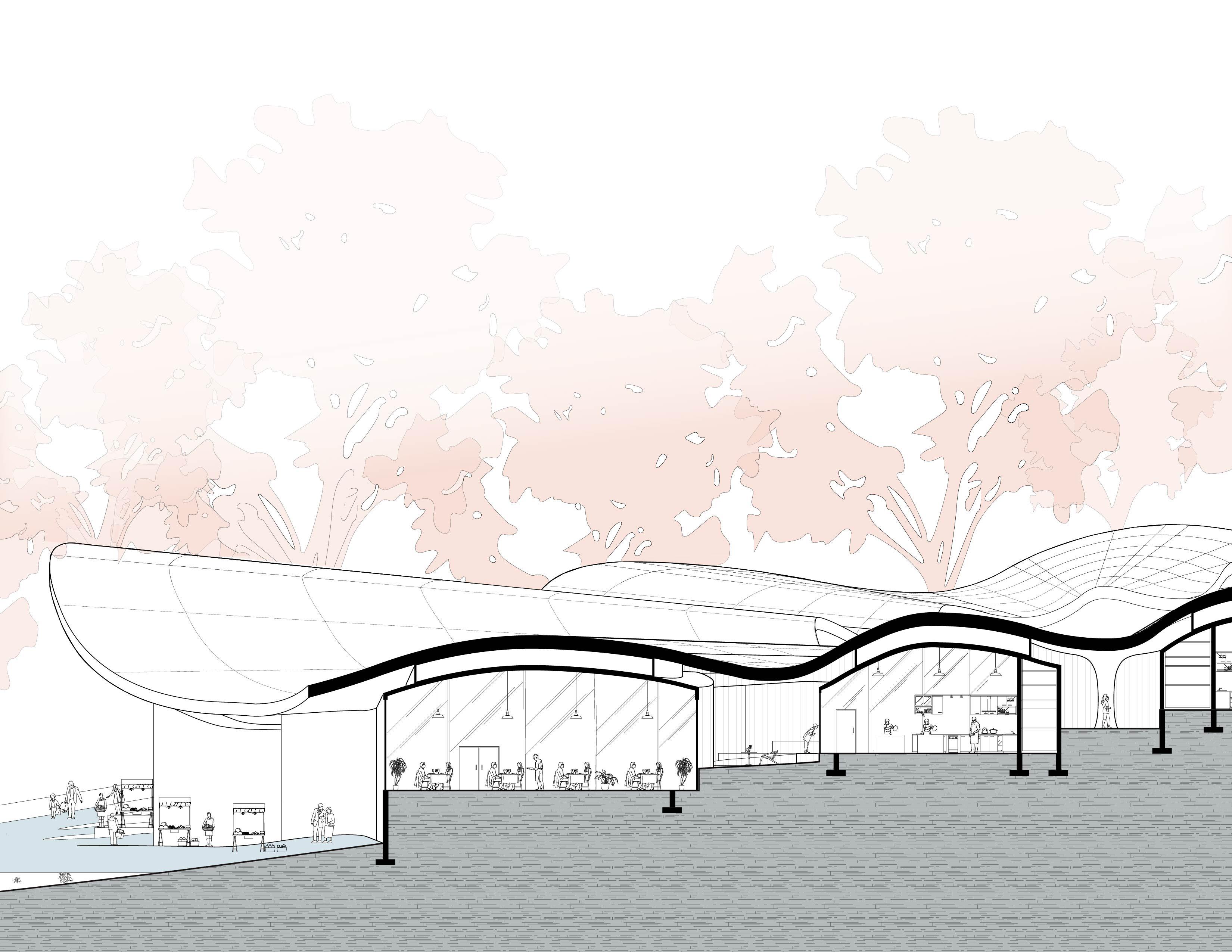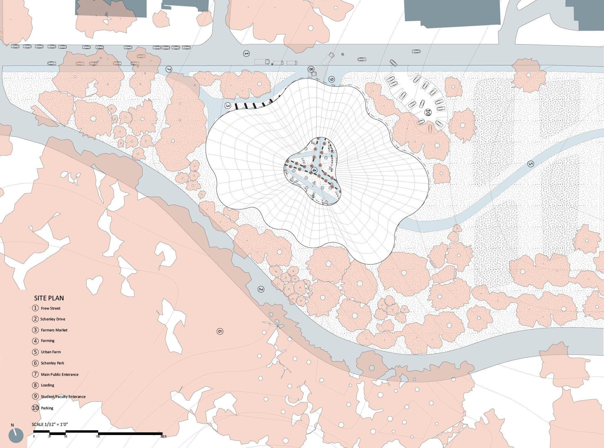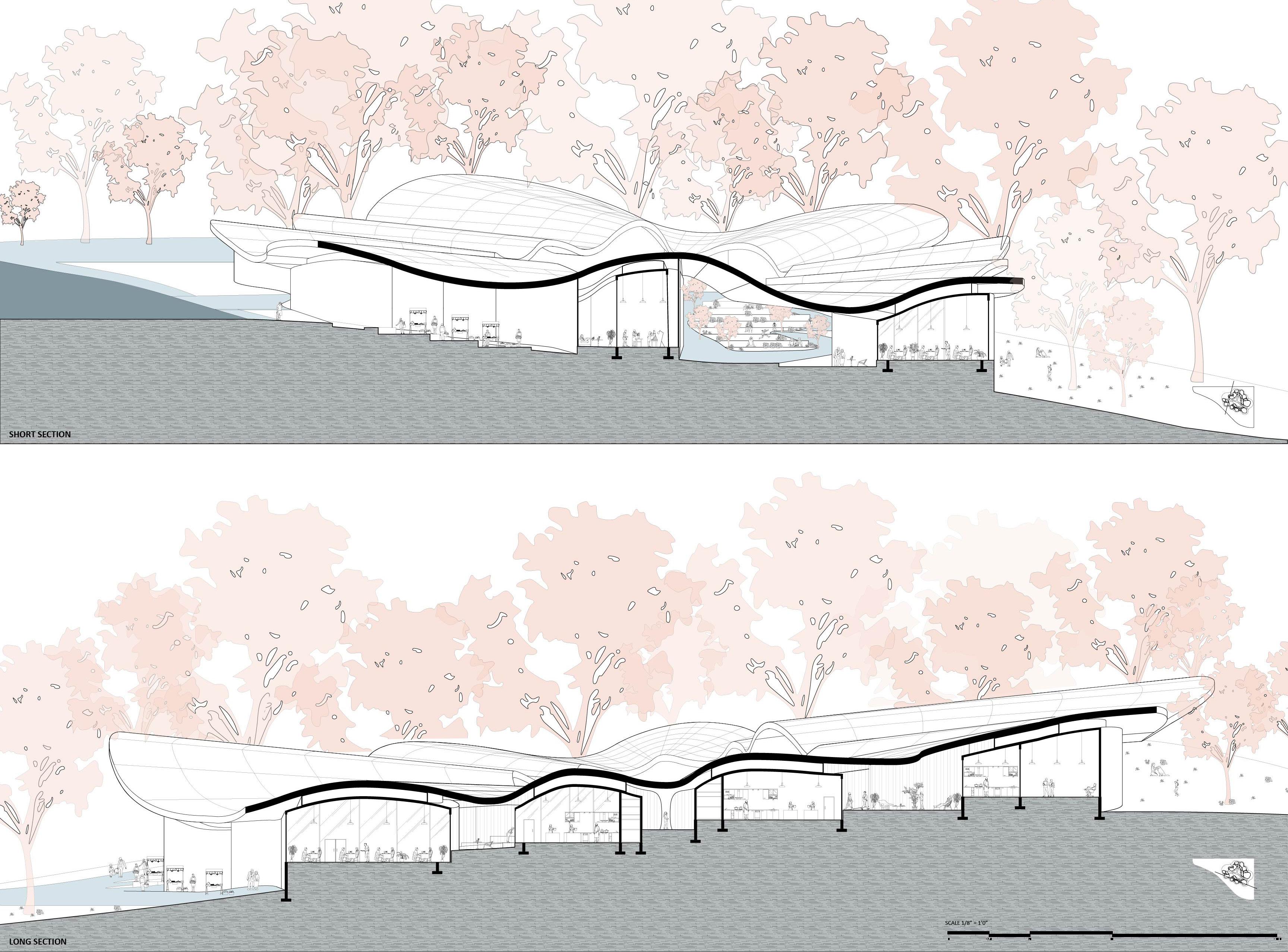 Thus, our culinary institute developed into a radial form, where the central farming courtyard cultivates an immersive learning environment connected between the students of the culinary institute and the public. The students’ classrooms and kitchens are ordered along the east side of the site according to their daily schedule, while the public is drawn to the site from the west side first to attend community farmers markets and then invited into the student courtyard. Following the curvilinear form in plan view, glass curtain walls on the inner side of the student facilities invite public discovery while students showcase their own work in the farmers markets. Mirroring the slope of the site, the roof condition resembles the cyclical, interwoven nature of this community togetherness, while also enabling the sun and water-catching features of the courtyard.