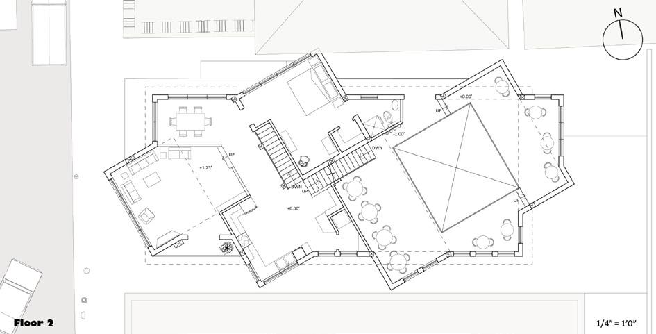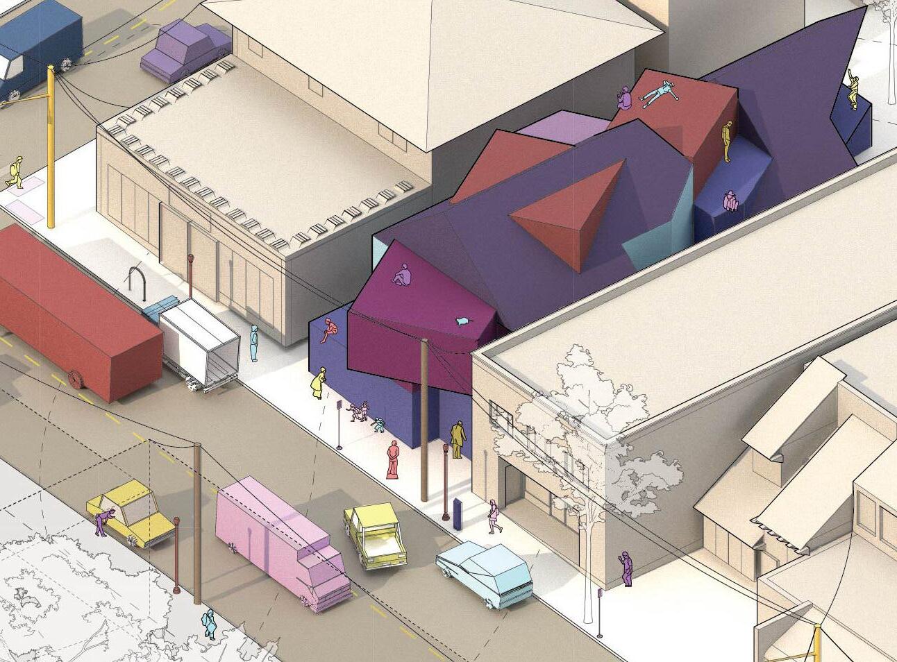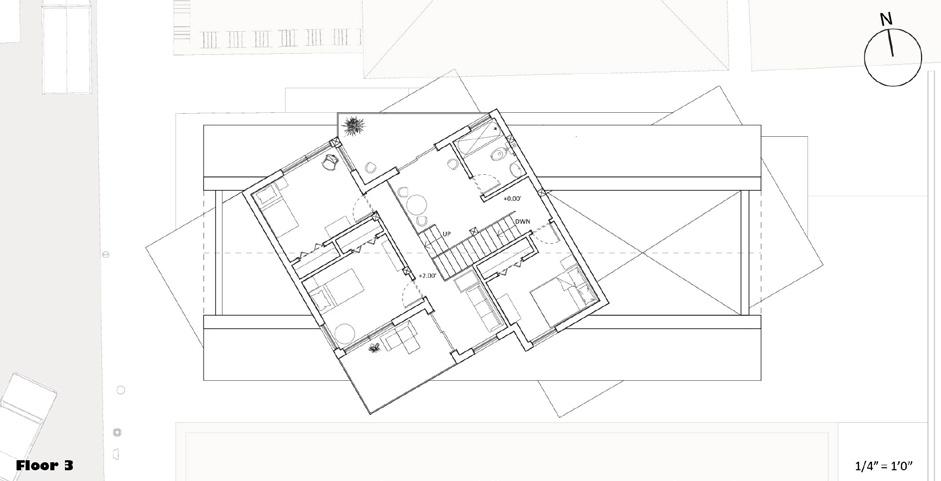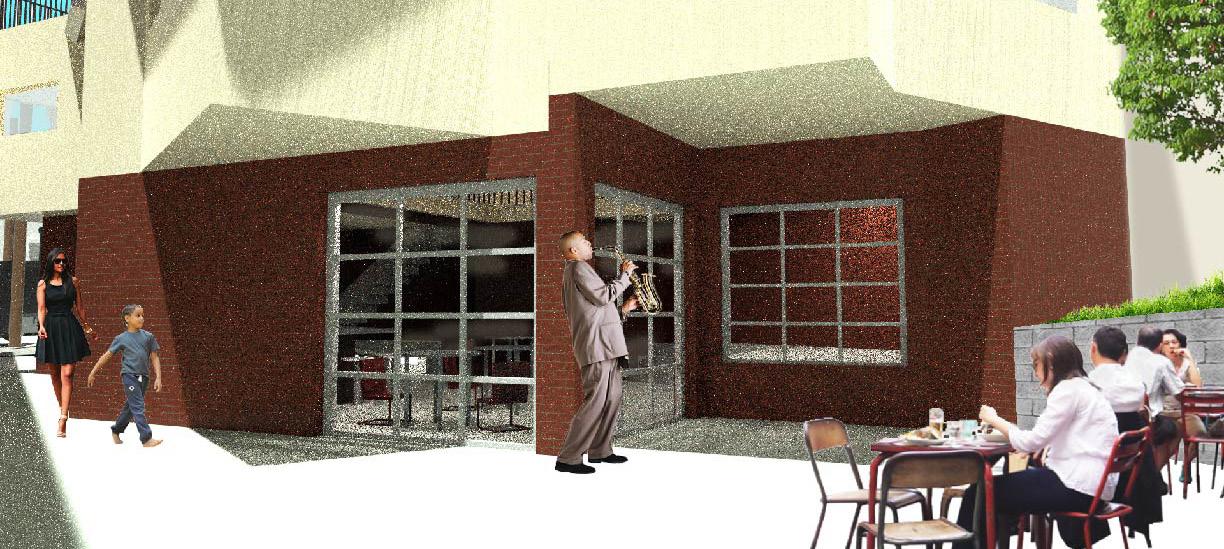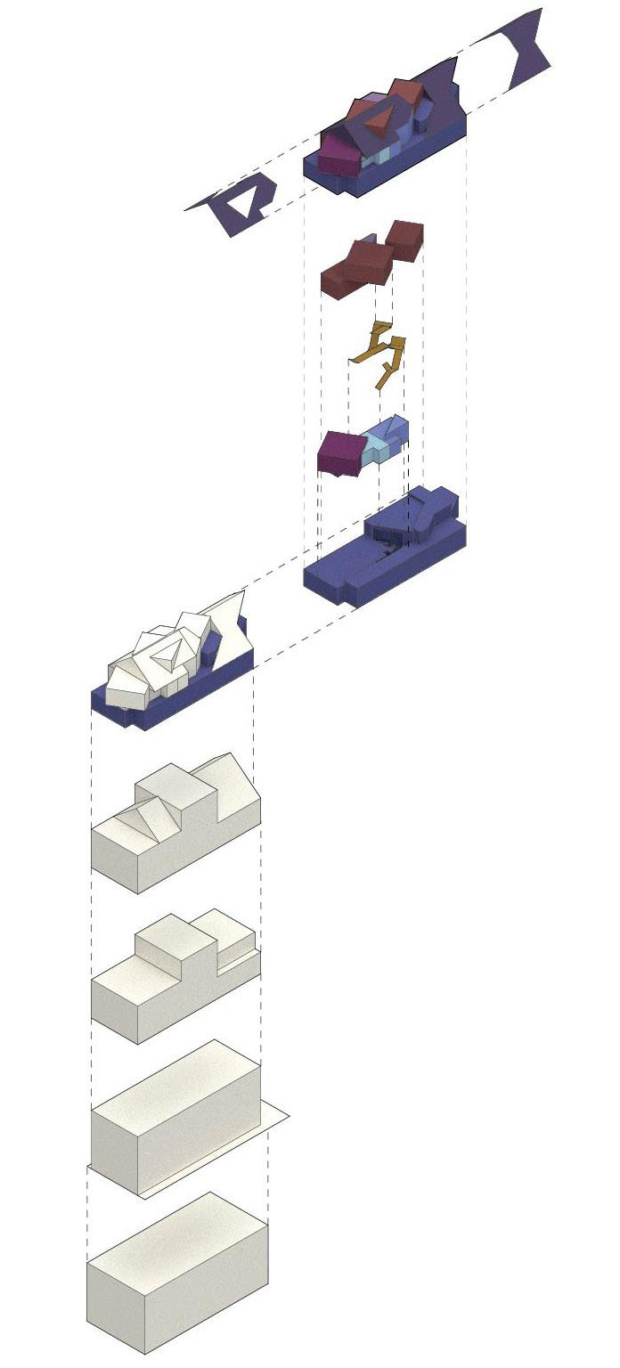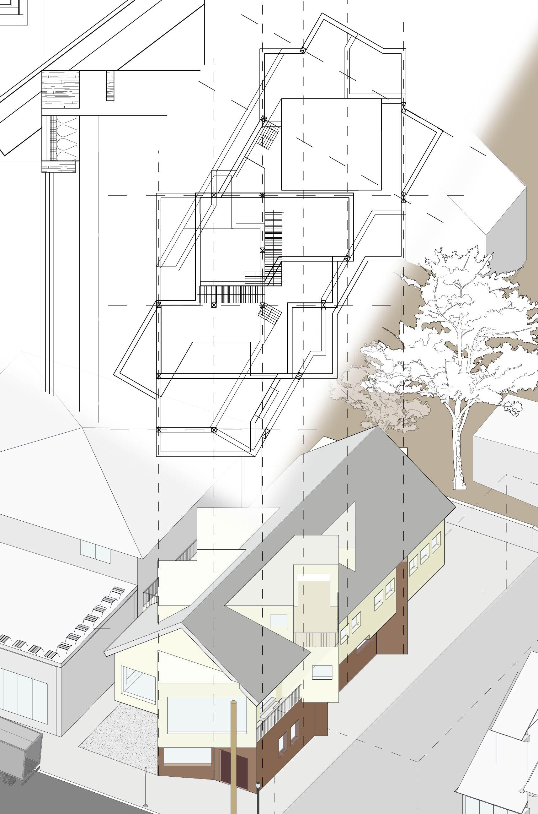 My design reflects the collage of building styles found in Squirrel Hill by interlocking organizational grid systems which derive the form. The result is a series of jut outs at 30 degree angles, resembling the nature of jazz as having never conformed to the normal. These crevasses draw visitors in to explore the inside, only to be welcomed into the hearth of the stage and multi-story gathering space. The unique forms enabled by the grid system allow for the merging of inside and outside, and the creation of an array of different spaces for both the public and the residents, thereby crafting a space of community empowerment through the musical and material language of jazz.