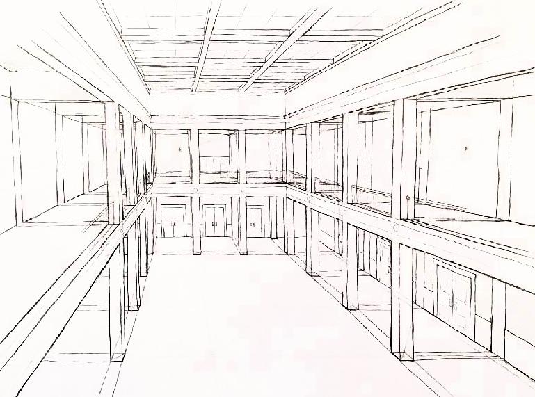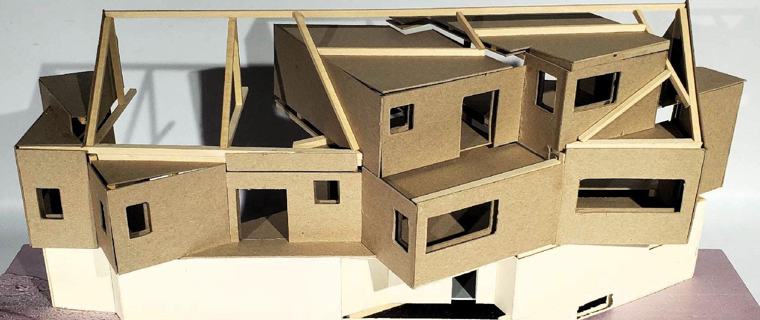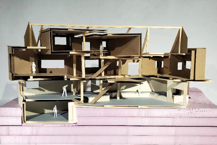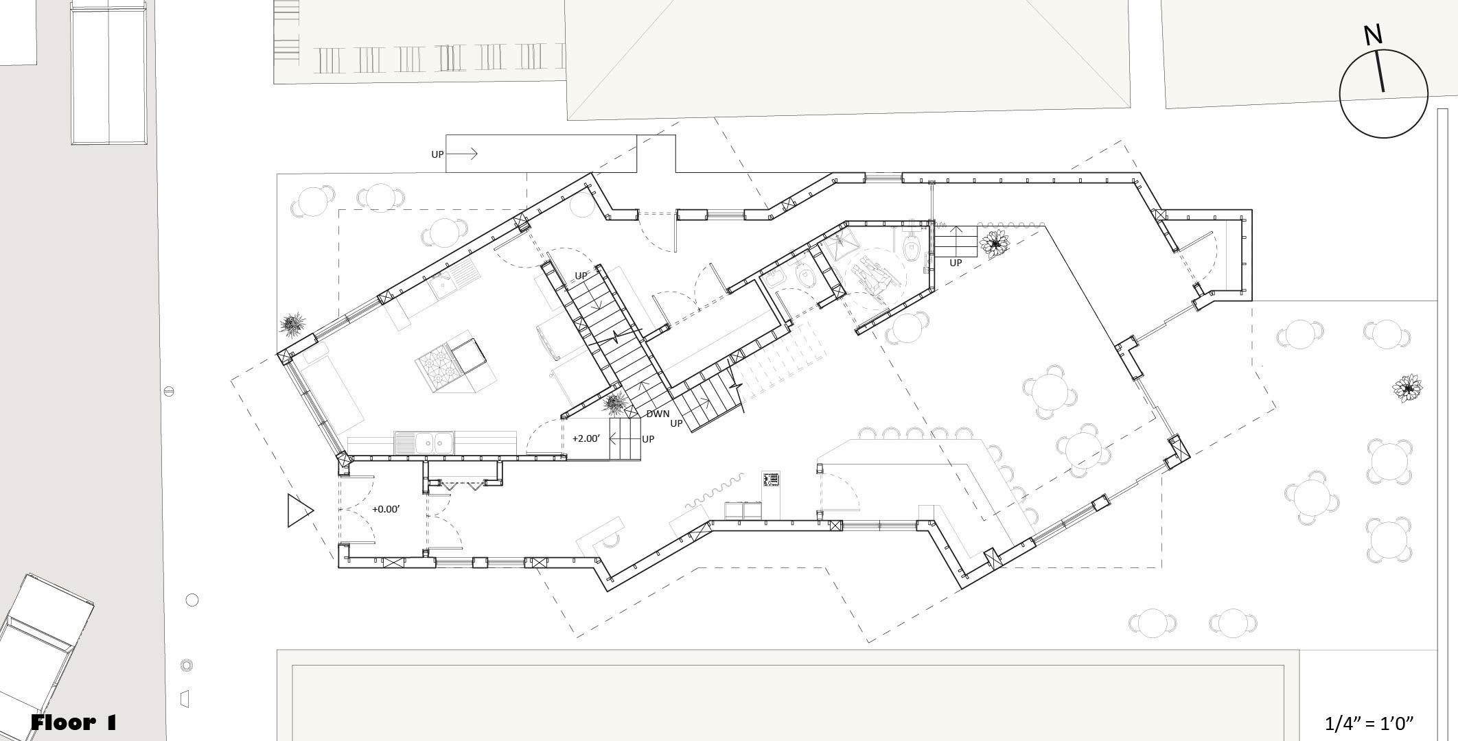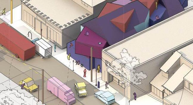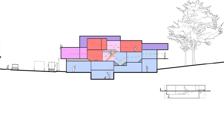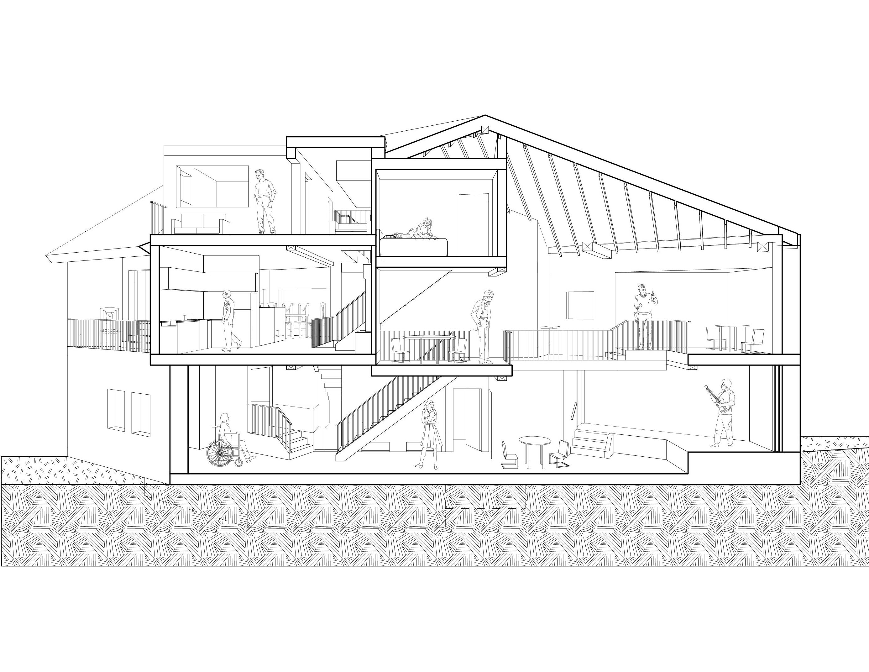My design reflects the collage of building styles found in Squirrel Hill by interlocking organizational grid systems which derive the form. The result is a series of jut outs at 30 degree angles, resembling the nature of jazz as having never conformed to the normal. These crevasses draw visitors in to explore the inside, only to be welcomed into the hearth of the stage and multi-story gathering space. The unique forms enabled by the grid system allow for the merging of inside and outside, and the creation of an array of different spaces for both the public and the residents, thereby crafting a space of community empowerment through the musical and material language of jazz.
