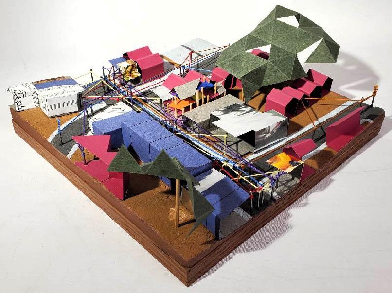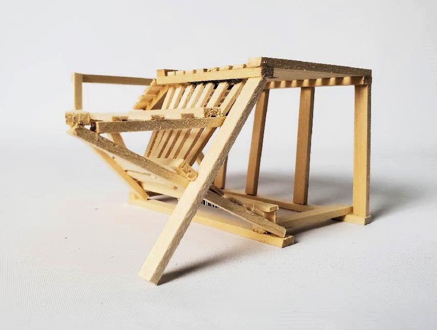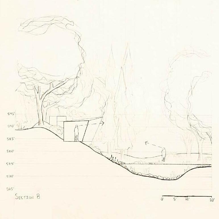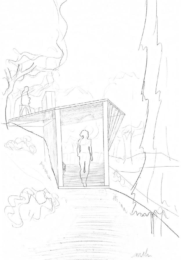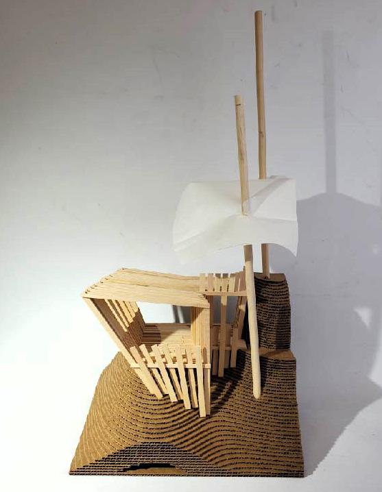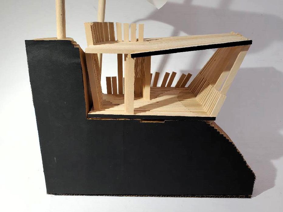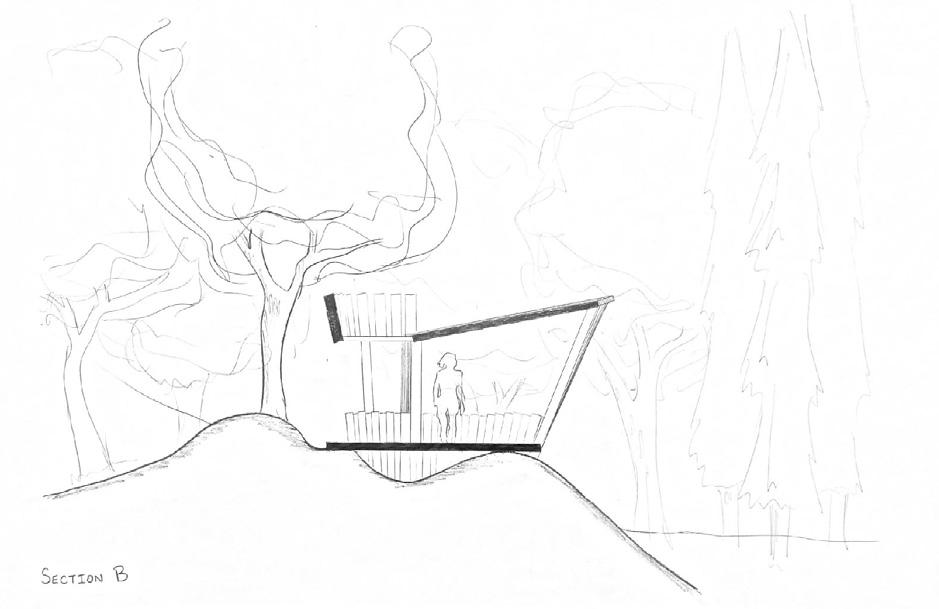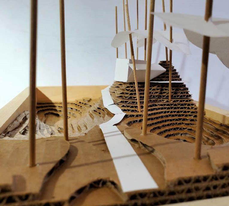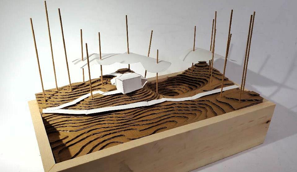 As the culmination of my first studio, this project practiced fundamental design and representation skills through a pavilion intervention in a chosen landscape. This pavilion had to present two separate moments of rest while staying confined in a small footprint to minimize environmental effects. Working only in hand drafting, analog drawing, and physical modeling, I had to define the structural tectonics through dimensional lumber and illustrate its human experience.