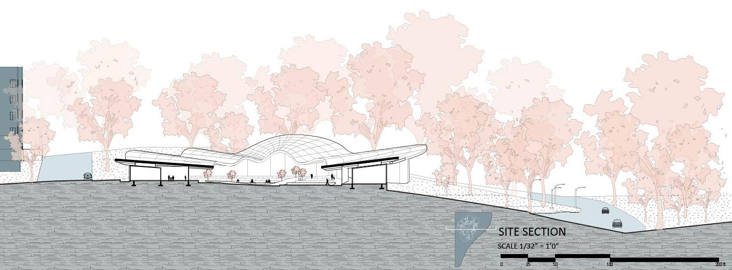 Thus, our culinary institute developed into a radial form, where the central farming courtyard cultivates an immersive learning environment connected between the students of the culinary institute and the public. The students’ classrooms and kitchens are ordered along the east side of the site according to their daily schedule, while the public is drawn to the site from the west side first to attend community farmers markets and then invited into the student courtyard. Following the curvilinear form in plan view, glass curtain walls on the inner side of the student facilities invite public discovery while students showcase their own work in the farmers markets. Mirroring the slope of the site, the roof condition resembles the cyclical, interwoven nature of this community togetherness, while also enabling the sun and water-catching features of the courtyard.