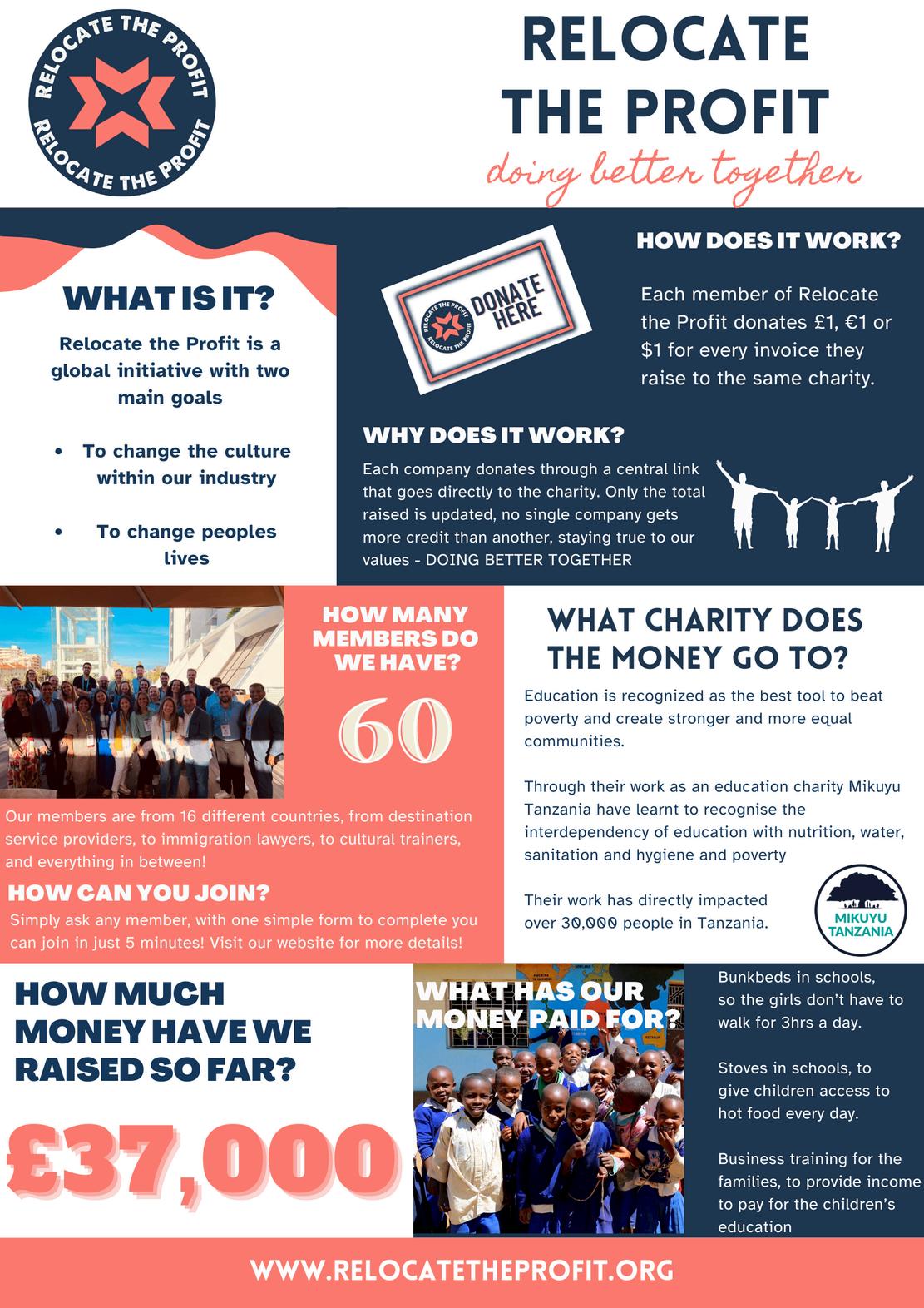 Relocate the Profit is a global, not-for-profit initiative founded by Ben Jones, Miriam van Kempen and Hannah Zentgraf within the relocation industry, with two simple but powerful goals: to change the culture of our industry, and to change people’s lives The idea is straightforward, instead of one company making a one-off donation, we come together as an industry and give consistently, transparently, and collectively
