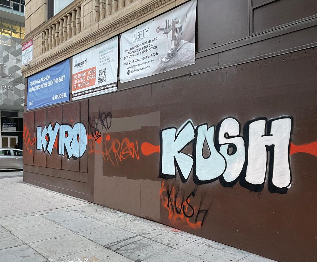 • Updated signage on trash cans and Heart of Downtown LA signage on utility boxes, bus shelters, and vacant storefronts.