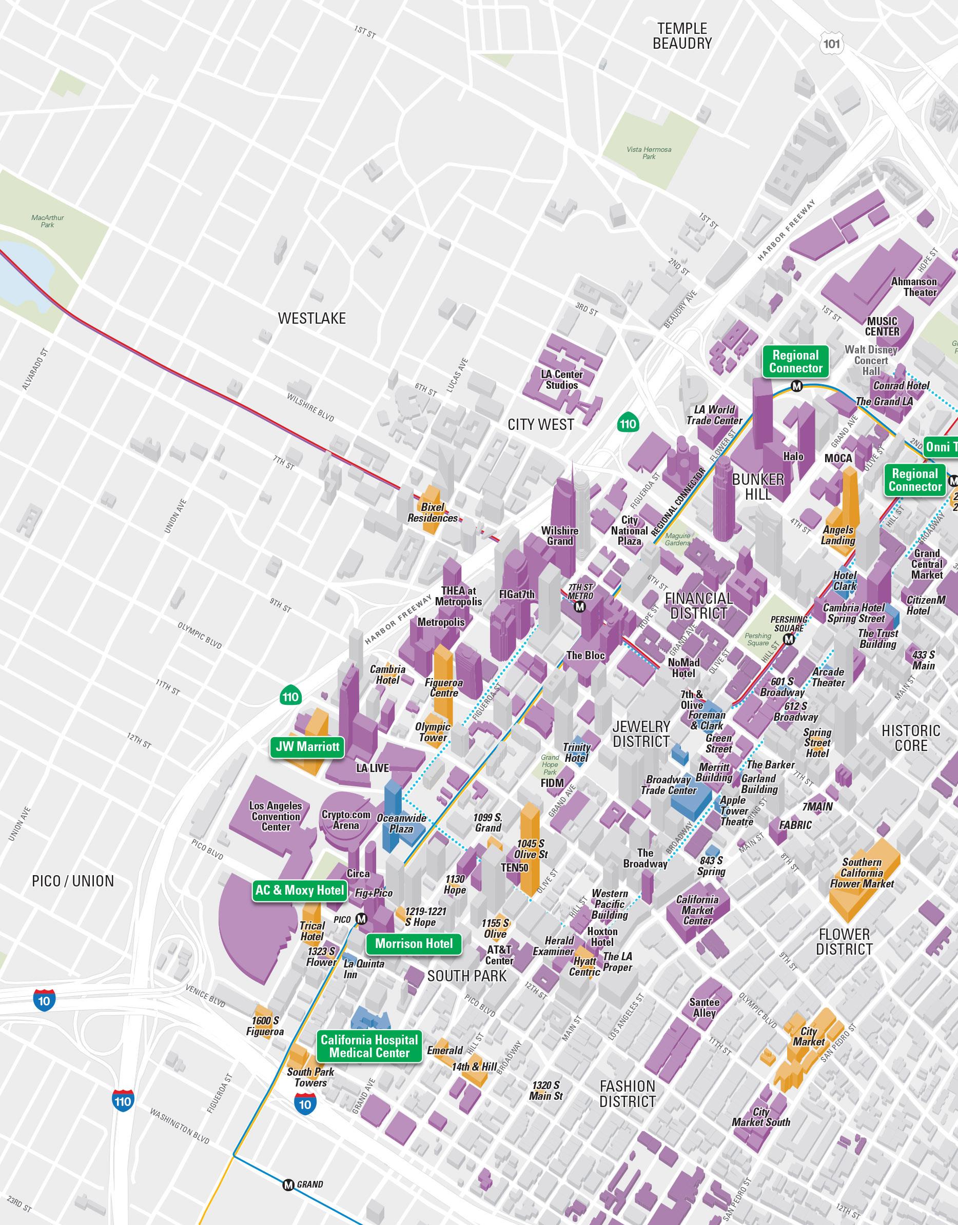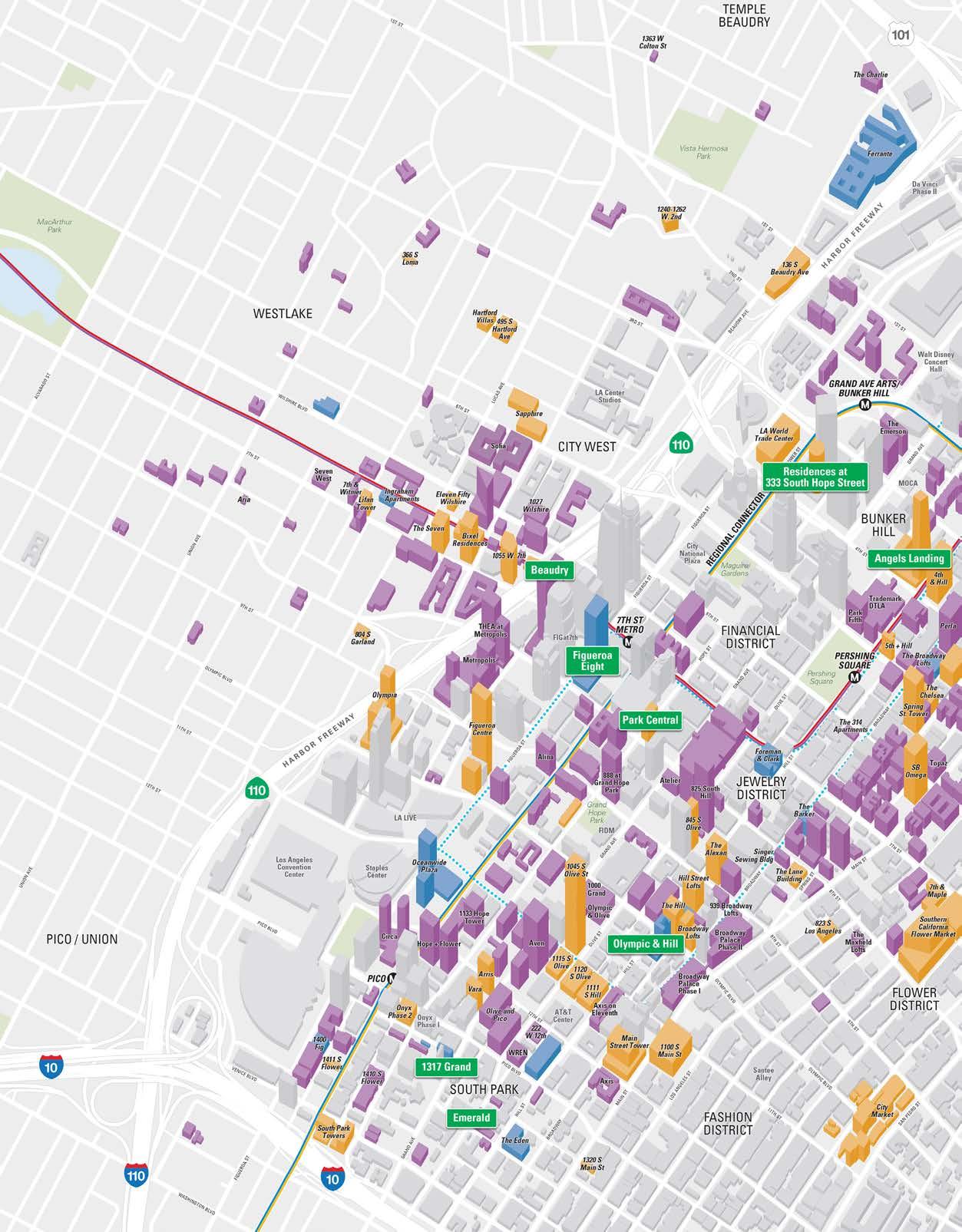 Name Neighborhood Description Beaudry Bunker Hill 785 luxury residential units developed and managed by Brookfield Prop. AC & Moxy Hotel South Park 727 rooms across from the LA Convention Center Regional Connector Bunker Hill/Historic/Little Tokyo 1.9-mile light rail connection with three new stops in DTLA Emerald DTLA South Park The latest from local developer JADE Enterprises has 154 residential units