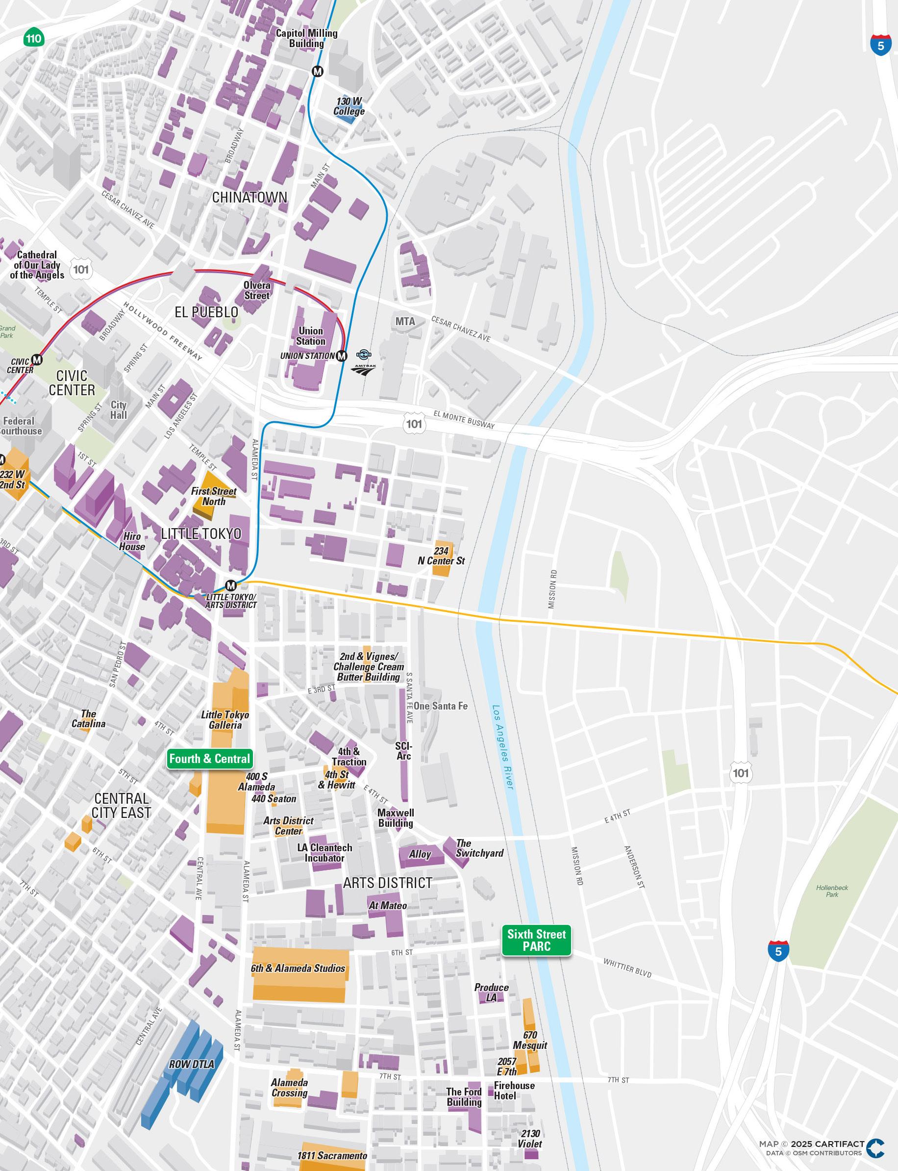 The DTLA Alliance defines Downtown Los Angeles as the area bounded by the 110, 101 and 10 freeways and the LA River, plus Chinatown, City West, and Exposition Park. The projects contained in this report are within a portion of Downtown Los Angeles, shown on the map to the left.