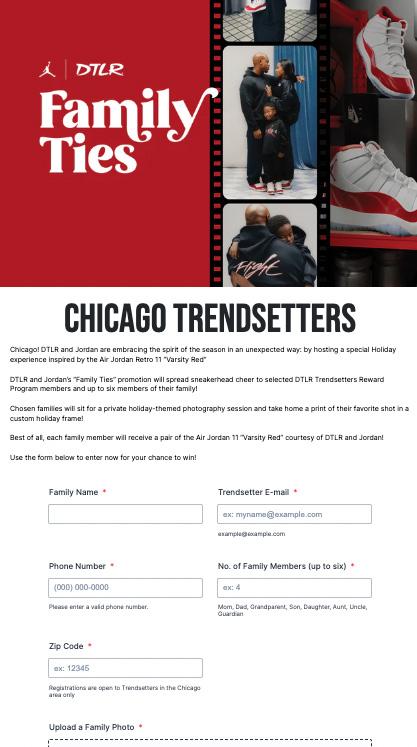 a pair of the shoes for each family member, but also participated in a professional holiday-themed family photo shoot with Grizel Preciado -- an official photographer from the Jordan Brand Women’s Collective. Each family was able to take home a print of their favorite shot in a custom holiday frame. The experience was held at the DTLR store on 87th and Dan Ryan in the DTLR Radio Studio and Greenroom, which was transformed for the day into a photo studio. The families were selected via in-store reference and an online contest that was held for DTLR Trendsetters, our loyalty program.