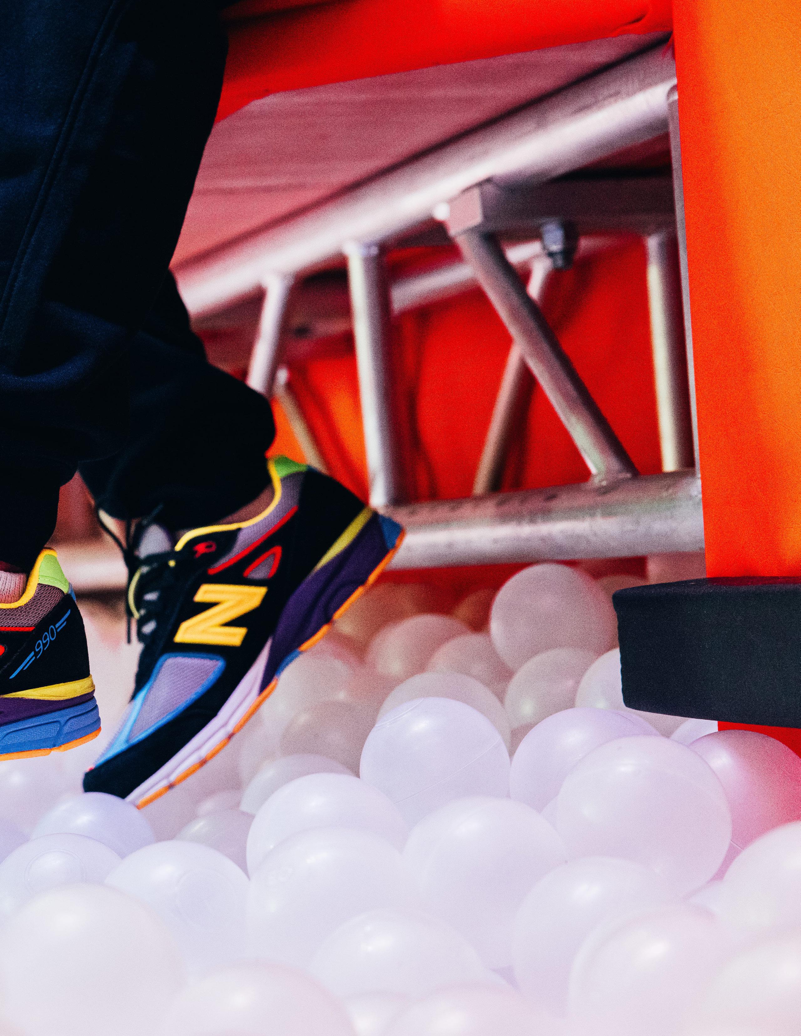 The upper is dressed primarily in lush black suede, which appears on the mudguards, quarter panels, eyestays, and heel panels. “Shadow Grey” mesh underlays run throughout, providing breathability for those warm days on the playground. The two-toned look is broken up by light “Sky Blue,” “Electric Red,” and “Chloro Green” leather panels that arrive on the forefoot, midfoot, and heel sections. “Pineapple”–colored “N” overlays are displayed on the lateral and medial sides, and “990” is printed on the lateral heels in “Sky Blue.”