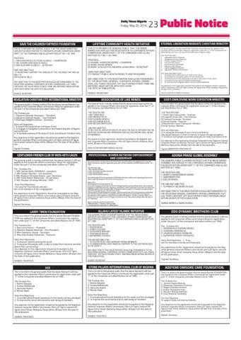 ADONIA PRAISE GLOBAL ASSEMBLY THE GENERAL PUBLIC IS HEREBY NOTIFIED THAT THE ABOVE NAMED ASSEMBLY HAS APPLIED TO THE CORPORATE AFFAIRS COMMISSION FOR REGISTRATION UNDER PART “C” OF THE COMPANIES AND ALLIED MATTERS ACT 1990. THE TRUSTEES ARE: 1. HENRY CHUKWUEMEKA OKORO 2. OGBONNAYA OKO 3. EVELYN OKORO THE AIM AND OBJECTIVE: 1. TO PREACH THE WORD OF GOD ANY OBJECTION TO THIS REGISTRATION SHOULD BE FORWARDED TO THE REGISTRAR GENERAL CORPORATE AFFAIRS COMMISSION, PLOT 420, TIGRIS CRESCENT, OFF AGUIYI IRONSI STREET, MAITAMA, ABUJA WITHIN 28 DAYS OF THIS PUBLICATION. SIGNED: BARR K.U. NWACHUKWU