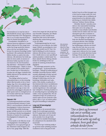 fornemmelsen af, at man har nået et tilfredsstillende niveau,” siger professor Michael Hauschild, DTU Management. Han er en af verdens førende forskere inden for absolut bæredygtighed. Grundtanken i disciplinen er, at naturens bæreevne afgrænser et samlet sikkert råderum for, hvor meget mennesker kan bruge og påvirke naturen, uden at det har uacceptable konsekvenser for naturens fremtidige kvalitet og tilstand. Alle samfundets aktiviteter tildeles derefter en andel af det sikre råderum. Alle aktiviteter bør holde sig inden for deres andel, så summen af aktiviteter holder sig inden for naturens bæreevne. De mest livsnødvendige aktiviteter – eksempelvis at skaffe mad til befolkningen – tildeles et større rum i forhold til mere perifere aktiviteter. Derefter kan en virksomhed se, hvordan den selv ligger i forhold til det tildelte råderum for den aktivitet, som den arbejder med. ”Den dårlige nyhed set med en virksomheds øjne er, at den temmelig sikkert ikke kan påstå, at den er bæredygtig i dag. Det er der praktisk taget ingen virksomheder, der er. Men den gode nyhed er som sagt, at man i det mindste får anskueliggjort afstanden til målet og kan starte en strategisk proces for, hvordan målet kan nås,” kommenterer Michael Hauschild. Tøjvask i EU I et forskningssamarbejde med Safety and Environmental Assurance Centre (SEAC), som koordinerer arbejdet med bæredygtighed i Unilever-koncernen, har Michael Hauschilds forskningsgruppe udviklet og testet en ny metode til vurdering af absolut bæredygtighed. Metoden er benyttet til at undersøge bæredygtighed af vaskepulver og tøjvask. Vel at mærke er der ikke kun set på bæredygtigheden i fremstillingen af vaskepulveret, men også på brugen af det. Tilsammen vasker borgerne i EU tøj 34,3 mia. gange årligt. Tallet illu-