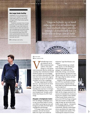 indmøllevinger testes og certificeres, før de bliver monteret på selve møllerne. Men udfordringen er, at de eksisterende testmetoder ikke har udviklet sig synderligt siden vindindustriens fødsel. Problemet gælder især test af daglige laster, som kaldes udmattelsestest. I dag testes disse laster ved at sætte vingerne i svingninger op og ned. En typisk test vil forløbe over to mio. svingninger. ”Det tager rigtig lang tid at udføre disse test – op mod et år for de største vinger, der i dag når 107 meter, og det er lang tid at vente for industrien. Samtidig tester man kun i to retninger, selvom virkelighedens laster er meget mere komplicerede,” fortæller seniorforsker Kim Branner fra DTU Vindenergi. Afspejler virkeligheden bedre DTU har deltaget i udviklingen af en ny type testværktøj, kaldet en exciter, som effektivt og hurtigt kan teste møllevingerne på måder, der bedre ligner virkelighedens påvirkninger. ”Vi forsøger at gøre testene mere realistiske, end man har kunnet hidtil. Det vil give store fordele for