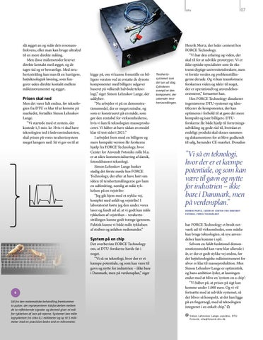 har FORCE Technology et bredt netværk ud til virksomheder, som måske kan bruge teknologien, så nye anvendelser kan komme i spil. Selvom en fuldt funktionel demonstrationsmodel kan være klar allerede i år, er der et godt stykke vej endnu, før det højteknologiske måleinstrument for alvor er klar til masseproduktion. Men Simon Lehnskov Lange er optimistisk, og hans ambition lyder, at løsningen ender med at blive en ’system on a chip’: ”Vi håber på, at prisen på sigt kan komme under 1.000 euro. Og vi vil fortsætte med at udvikle systemet, så det bliver så kompakt, at det kan ligge på en fingernegl, med al teknologien integreret i en enkelt chip.” imo n Leh n s kov L a n ge , p o std o c , DT U S Foto n ik , s l l a @ foto n i k . d t u . d k