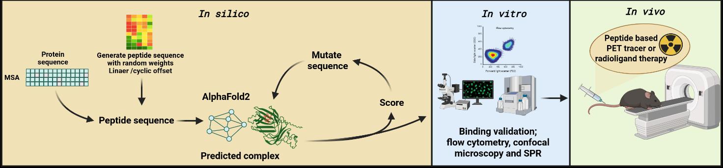 The project combines computational peptide design with preclinical translational assessment. The computational component will focus on leveraging different AlphaFold-based AI tools such as EvoBind, BindCraft, and PepMLM to identify short, high-affinity peptides capable of specifically recognizing cell proteins. The most promising peptide candidates will be synthesized, validated for target binding in vitro, and tested in vivo to assess their feasibility as peptide-based agents for molecular imaging and radionuclide therapy (see workflow below)
