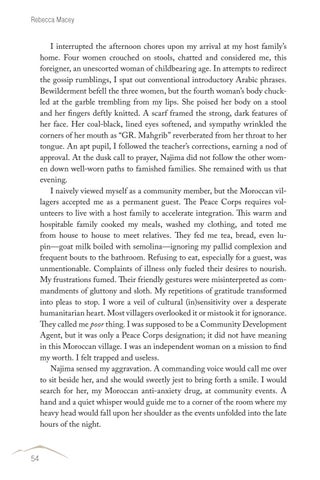 I interrupted the afternoon chores upon my arrival at my host family’s home. Four women crouched on stools, chatted and considered me, this foreigner, an unescorted woman of childbearing age. In attempts to redirect the gossip rumblings, I spat out conventional introductory Arabic phrases. Bewilderment befell the three women, but the fourth woman’s body chuckled at the garble trembling from my lips. She poised her body on a stool and her fingers deftly knitted. A scarf framed the strong, dark features of her face. Her coal-black, lined eyes softened, and sympathy wrinkled the corners of her mouth as “GR. Mahgrib” reverberated from her throat to her tongue. An apt pupil, I followed the teacher’s corrections, earning a nod of approval. At the dusk call to prayer, Najima did not follow the other women down well-worn paths to famished families. She remained with us that evening. I naively viewed myself as a community member, but the Moroccan villagers accepted me as a permanent guest. The Peace Corps requires volunteers to live with a host family to accelerate integration. This warm and hospitable family cooked my meals, washed my clothing, and toted me from house to house to meet relatives. They fed me tea, bread, even lupin—goat milk boiled with semolina—ignoring my pallid complexion and frequent bouts to the bathroom. Refusing to eat, especially for a guest, was unmentionable. Complaints of illness only fueled their desires to nourish. My frustrations fumed. Their friendly gestures were misinterpreted as commandments of gluttony and sloth. My repetitions of gratitude transformed into pleas to stop. I wore a veil of cultural (in)sensitivity over a desperate humanitarian heart. Most villagers overlooked it or mistook it for ignorance. They called me poor thing. I was supposed to be a Community Development Agent, but it was only a Peace Corps designation; it did not have meaning in this Moroccan village. I was an independent woman on a mission to find my worth. I felt trapped and useless. Najima sensed my aggravation. A commanding voice would call me over to sit beside her, and she would sweetly jest to bring forth a smile. I would search for her, my Moroccan anti-anxiety drug, at community events. A hand and a quiet whisper would guide me to a corner of the room where my heavy head would fall upon her shoulder as the events unfolded into the late hours of the night.